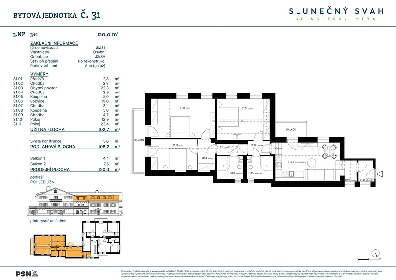 Apartmán 4+kk v projektu Slunečný svah představuje ideální volbu pro ty, kdo hledají dostatek prostoru v horském prostředí s vysokým standardem provedení. Rezidence na klidném místě nad centrem Špindlerova Mlýna spojuje tradiční krkonošský ráz s moderní architekturou a technologií. Byt je připravený ihned k nastěhování. Velkorysá jednotka o výměře 108.20 m² ve 3. nadzemním podlaží je navržena pro pohodlný pobyt větší rodiny či skupiny přátel. Dispozice zahrnuje prostorný obývací pokoj s přípravou na kuchyň, tři samostatné ložnice, dvě koupelny a vstupní chodbu s prostorem na vestavěné skříně. Součástí jednotky jsou 2 balkony a parkovací stání. Jednotka je dokončena v provedení fit out – s hotovými koupelnami, podlahami, interiérovými dveřmi a veškerou přípravou pro kuchyň i technologie. Projekt nabízí obyvatelům společné zázemí pro úschovu sportovního vybavení a zároveň díky promyšlenému umístění i dostatek soukromí. Energeticky úsporný provoz zajišťuje tepelné čerpadlo v kombinaci s fotovoltaikou. Slunečný svah se nachází na jižním svahu nad centrem Špindlerova Mlýna. Díky nadmořské výšce přes 700 m n. m. nabízí nádherné výhledy na údolí i okolní hřebeny. V pěší vzdálenosti je centrum města s restauracemi, obchody a sjezdovkami, včetně přímého napojení na lyžařský areál. Lokalita je ideální nejen pro zimní sporty, ale i letní turistiku, cyklistiku a celoroční relaxaci v přírodě.