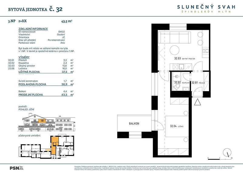 Apartmán o dispozici 2+kk je součástí komorního projektu Slunečný svah, který citlivě navazuje na architekturu krkonošských chalup a zároveň přináší současné standardy horského bydlení. Projekt vzniká v klidné části Špindlerova Mlýna s přímým výhledem na sjezdovku a jen několik minut od centra města. Apartmán je připravený ihned k nastěhování. Apartmán je připravený ihned k nastěhování. Jednotka o podlahové ploše 38.90 m² se nachází v 3. nadzemním podlaží a nabízí komfortní zázemí pro rekreaci v kterémkoli roční období. Dispozice zahrnuje prostorný obývací pokoj s přípravou na kuchyňskou linku, ložnici, koupelnu se sprchovým koutem a toaletou a vstupní předsíň. K apartmánu náleží balkon a parkovací stání. Jednotka je dokončena v provedení fit out – s hotovou koupelnou, podlahami, interiérovými dveřmi a veškerou přípravou pro kuchyň i technologie. Projekt nabízí obyvatelům společné zázemí pro úschovu sportovního vybavení a zároveň díky promyšlenému umístění i dostatek soukromí. Energeticky úsporný provoz zajišťuje tepelné čerpadlo v kombinaci s fotovoltaikou. Slunečný svah se nachází na jižním svahu nad centrem Špindlerova Mlýna. Díky nadmořské výšce přes 700 m n. m. nabízí nádherné výhledy na údolí i okolní hřebeny. V pěší vzdálenosti je centrum města s restauracemi, obchody a sjezdovkami, včetně přímého napojení na lyžařský areál. Lokalita je ideální nejen pro zimní sporty, ale i letní turistiku, cyklistiku a celoroční relaxaci v přírodě.