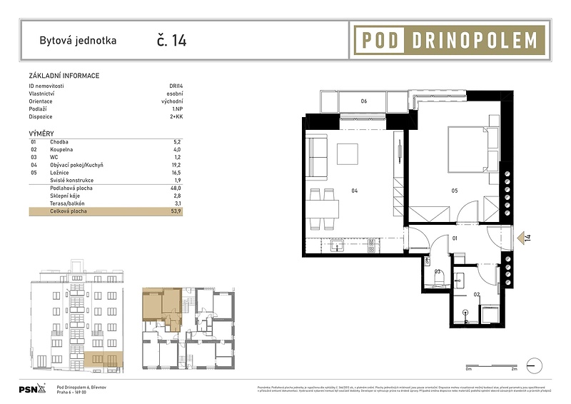 Byt o dispozici 2+kk je součástí rezidenčního projektu Pod Drinopolem, který vzniká kompletní rekonstrukcí bytového domu v jedné z nejklidnějších částí Prahy 6. Lokalita uprostřed vilové čtvrti nabízí kombinaci zeleně, soukromí a výborné dostupnosti do centra. Součástí domu je soukromá sauna a posilovna. Půdorys bytu v 1. podlaží a o a podlahové ploše 54,4 m² zahrnuje obývací pokoj s přípravou na kuchyni, ložnici, vstupní chodbu, praktickou komoru, koupelnu se sprchovým koutem a samostatnou toaletou. K jednotce náleží také sklepní kóje. Byt bude dokončen v provedení fit out – včetně hotové koupelny, podlah, dveří a kompletních rozvodů. Veškeré vybavení odpovídá současným standardům moderního bydlení. Dům prochází celkovou rekonstrukcí, jejíž součástí je nový výtah, vstupní portály s bezpečnostními dveřmi a kvalitně provedené společné prostory s keramickou dlažbou a dřevěnými prvky. Obyvatelům bude k dispozici relaxační zóna se saunou a fitness, kolárna, prádelna a upravený vnitroblok s klidovou částí a posezením. Rezidence se nachází v tiché ulici Pod Drinopolem, obklopené zelení a rezidenční zástavbou. V docházkové vzdálenosti je veškerá občanská vybavenost včetně obchodů, kaváren, škol i zastávek MHD. Lokalita nabízí pohodové zázemí s rychlým spojením do centra i na letiště.