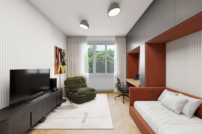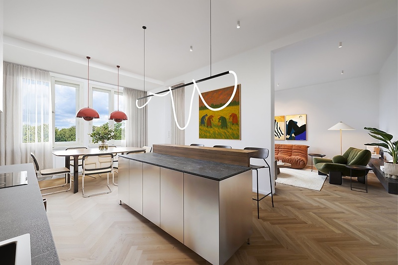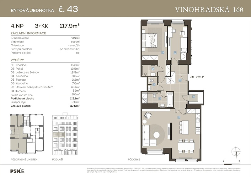 Byt o dispozici 3+kk a podlahové ploše 115,1 m² nabízí velkorysý prostor, který si vás získá už při prvním kroku. Nachází se ve 4. podlaží reprezentativního domu po luxusní rekonstrukci a je připraven k dokončení ve standardu fit out – nové parkety, omítky, interiérové i vstupní dveře a kompletní nové rozvody vám dávají ideální základ pro vytvoření domova přesně podle vašich představ. Velký obývací prostor s přípravou na kuchyňský kout je srdcem bytu – prosvětlený, vzdušný a stvořený pro společná setkání. Dvě ložnice nabízejí soukromí a klid, nechybí koupelna, samostatné WC ani dostatek úložného prostoru. Samozřejmostí je praktická sklepní kóje. Celý dům spojuje noblesu historické architektury s moderním komfortem. Reprezentativní vstupní prostory zdobí dřevo, mramor, kartáčovaný bronz i sklo. Nechybí recepce, sauna ani vnitroblok se zahradou – dokonalé místo pro chvíle klidu uprostřed města. Vinohrady jsou synonymem pro životní styl, který spojuje eleganci a energii města. Čekají vás tu kavárny s výběrovou kávou, bistra s avokádovým toastem i vinárny, kde znáte jménem nejen sommeliéra, ale i sousedy. Přilehlé parky s dechberoucími výhledy lákají k odpočinku i sportu, farmářské trhy k setkávání a místní divadla a galerie k inspiraci. Podle časopisu Time Out patří Vinohrady mezi nejvíce „cool“ čtvrti na světě. Tady prostě chcete žít.