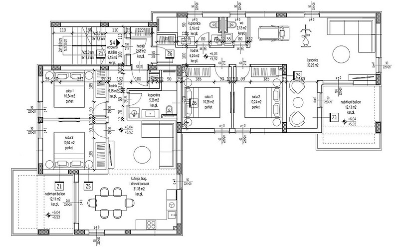 Byt S2 se nachází v 1. patře v severozápadní části budovy a skládá se z: Kuchyně, jídelny a obývacího pokoje | 31,35 m2 Ložnice 1 | 10,54 m² Ložnice 2 | 10,54 m² Koupelna | 5,38 m² Chodba | 5,15 m² CELKOVÁ velikost bytu 62,96 m². K nemovitosti patří následující další části a příslušenství: krytý balkon | 12,11 m² kryté parkovací místo | 13,75 m² nekryté parkovací místo | 13,75 m² střešní terasa | 71,59 m² Celková plocha bytu S2 včetně doplňkových částí a příslušenství je 174,16 m² a celková užitná plocha je 96,55 m². Prostorný otevřený obývací prostor propojený s kuchyní a jídelnou vytváří moderní a světlý prostor, který je ideální pro relaxaci a společenské setkávání. Velká prosklená stěna propouští do interiéru dostatek přirozeného světla a umožňuje přístup na krytý balkon. Dvě prostorné ložnice nabízejí dostatek místa pro dvojlůžka a pro maximální využití prostoru doporučujeme instalaci skříní na míru. Prostorná krytá terasa je ideálním místem pro venkovní posezení, ať už u ranní kávy, rodinného oběda nebo večerní relaxace, a nabízí ochranu před sluncem a nepříznivými povětrnostními vlivy. Všechny byty budou vybaveny prvotřídními parketami a keramickými dlaždicemi.