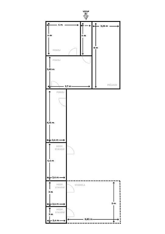 Dostatečná uliční šíře, zahrada se soukromím a možnost parkování na vlastním pozemku… To jsou základní parametry právě tohoto řadového rodinnému domu s dispozicí 2+1, který se nachází na ulici Ponětovská v obci Prace. Podlahová plocha domu činí přibližně 58 m2, přičemž na hlavní stavbu navazují hospodářské přístavky o ploše cca 22,6 m2 a otevřená stodola s výměrou 33,5 m2. Hospodářské přístavky jsou částečně podsklepené. Celková plocha pozemku činí 482 m2. Dům je svým stavem určen ke generální rekonstrukci nebo demolici. Dle současného územního plánu lze u nové výstavby počítat s jedním nadzemním podlažím a obytným podkrovím. Dále je potřeba počítat se sedlovou střechou. Minimální poměr zeleně na pozemku musí činit 40 %. Současná konstrukce domu je ze smíšeného zdiva a není zateplena. Základy jsou smíšené kamenné bez hydroizolací. Okna jsou původní – dřevěná kastlová. Na domě je v uliční části sedlová střecha a ve dvorní části pak pultová. Do domu je zavedena elektřina a je zde také zbudovaná přípojka k plynu (aktuálně odpojeno). Vodovodní a kanalizační řád je doveden do průjezdu domu. Přípojky do domu nejsou vybudovány. Na pozemku je dále studna na užitkovou vodu. Dispozice domu se skládá ze vstupní chodby a tří pokojů. V současném dispozičním řešení není koupelna ani WC. Jak již bylo zmíněno v úvodu, hlavními přednostmi nemovitosti je zejména uliční šíře, která Vám umožní jednak parkovat více vozidel přímo na pozemku, ale zajistí také lepší obslužnost zahrady. Další devízou je bezesporu prostorná zahrada s dostatkem soukromí, na kterou se Vám bez větší námahy vejde i bazén a zbude dostatek místa pro drobné zahradničení. Pokud tedy právě hledáte nemovitost, která má zajímavý pozemek, dobrou uliční šíři a nebojíte se pustit do větší rekonstrukce či výstavby, pak by pro Vás tato možnost mohla být tou pravou. Nemovitost je k dispozici ihned, prohlídky jsou možné po předchozí telefonické dohodě.