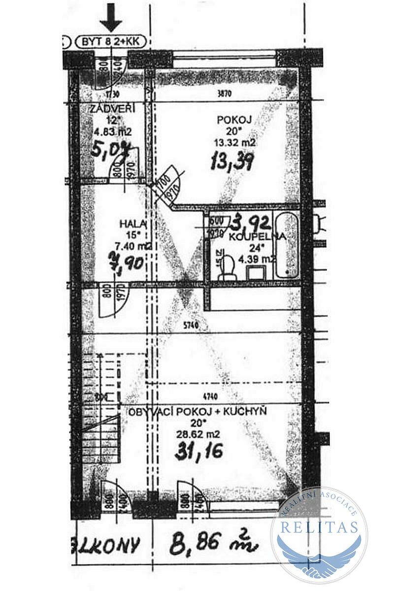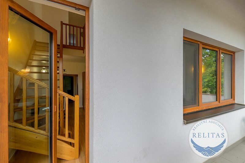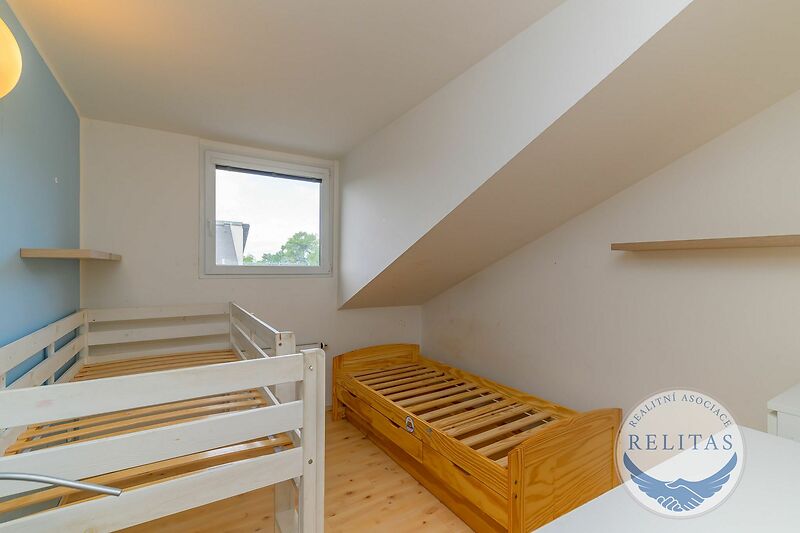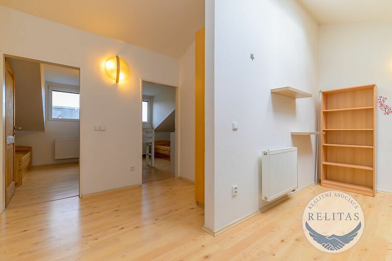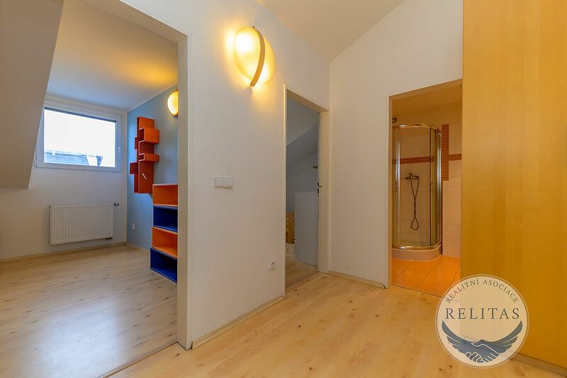 Byt se sestává ze dvou podlaží, přičemž na prvním, vstupním podlaží se nachází předsíň, obývací pokoj (31,2 m²) s kuchyňskou linkou a vstupem na balkon (8,9 m²) , manželská ložnice (13,4 m²) a koupelna s vanou a toaletou. Na druhém podlaží galerie, dva dětské pokoje (9 m² a 10,6 m²) a koupelna se sprchovým koutem a toaletou (vizte, prosím, půdorys). Kuchyňská linka je vybavena indukční deskou, mikrovlnou a pečící troubou. K bytu náleží dvě venkovní parkovací stání na pozemku před domem, která lze pronajmout za 1 000 Kč/měsíc/stání. Byt může být pronajat s vybavením jako na fotografiích, případně se s pronajímatelem lze domluvit na odstranění konkrétních kusů nábytku. Topení a ohřev vody zajištěn vlastním elektrickým kotlem. Budova má skvělý štítek energetické náročnosti budovy "B - velmi úsporná". Byt bude čerstvě vymalován.