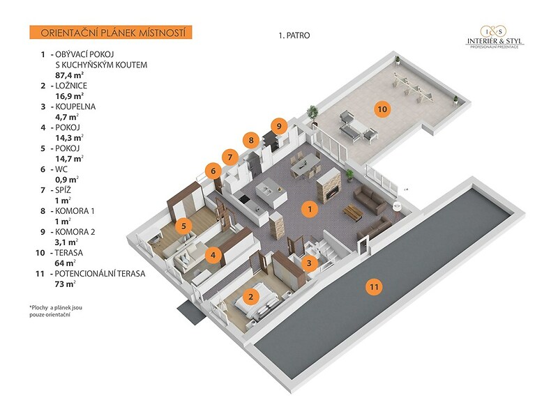 Hledáte dům, který nabízí víc než jen bydlení? Ve Velkém Přítočnu, pouhý kilometr od Kladna, se nachází prostorný rodinný dům, který spojuje komfortní rodinné zázemí, možnosti podnikání a odpočinek na soukromé zahradě. V obytné části domu najdete čtyři ložnice a dvě koupelny, přičemž jedna z ložnic je umístěna v přízemí – ideální volba pro hosty, seniory nebo pro ty, kdo chtějí mít pracovnu oddělenou od hlavního patra. Z této ložnice je navíc přímý vstup na zadní zahradu, což zajišťuje příjemné propojení interiéru s exteriérem. Dominantou interiéru je velký otevřený prostor obývacího pokoje, kuchyně a jídelny s centrálním krbem, který prostoru dodává jedinečnou atmosféru. Právě tady si lze představit klidné večery s rodinou nebo přáteli u praskajícího ohně. Z obytné části se vychází na dvě terasy, které přirozeně propojují interiér s exteriérem. Jednu z nich je možné upravit nebo přestavět na zimní zahradu – ideální místo pro celoroční odpočinek. Horní patro je navíc stavebně připravené i pro samostatný vstup na zadní zahradu, což umožňuje v budoucnu oddělit prostor pro vícegenerační bydlení nebo pronájem. Velkým benefitem je přízemí domu, které lze využít jako plnohodnotné zázemí pro podnikání, dílnu, sklad či garáž. Prostor pojme klidně šest až deset automobilů, ale díky dispozičnímu řešení může sloužit i jako kanceláře nebo showroom – ideální volba pro ty, kdo chtějí mít práci i domov pod jednou střechou. Zahrada nabízí příjemné soukromí a perfektní místo pro odpočinek. Najdete zde přírodní biotop i krytý bazén s protiproudem – kombinaci, která spojuje estetiku s funkčností a poskytuje ideální prostor pro relax po náročném dni. Fasáda domu zatím čeká na dokončení, což dává novému majiteli možnost vybrat si finální vzhled podle vlastního vkusu. S výběrem vhodné realizační firmy rádi pomůžeme. Okna jsou navíc připravena na instalaci venkovních rolet, které lze snadno doplnit podle individuálních preferencí. Velké Přítočno vyniká klidnou atmosférou a výbornou dostupností. Do centra Kladna se dostanete během několika minut, Praha je vzdálená přibližně dvacet minut jízdy. V obci nechybí základní občanská vybavenost, kavárna, bistro ani dobré dopravní spojení. Pokud hledáte dům, který dokáže spojit rodinné bydlení, podnikání i odpočinek, tahle nemovitost je ideální volbou.