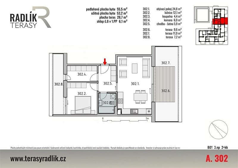 Hledáte klidné bydlení jen kousek od Prahy, kde si můžete užít prostor, soukromí a kontakt s přírodou? Tento moderní byt 2+kk by mohl být přesně pro vás. Nabízím byt o velikosti 55,5 m² s dvěma prostornými terasami o celkové ploše 28,7 m², které prakticky rozšiřují obytný prostor. Ideální pro ranní kávu, letní posezení s přáteli nebo klidné večery pod hvězdami. Dispozice bytu je promyšlená a pohodlná, jelikož obytný pokoj s kuchyňským koutem navazuje přímo na jednu z teras, stejně jako ložnice, což zajišťuje maximální komfort pro každodenní život. Součástí bytu je také sklepní kóje 6,1 m², kam snadno uložíte věci, které nepotřebujete mít po ruce. Komfort bydlení zvyšují elektrické zatemňovací žaluzie a podlahové topení. Byt se nachází v moderním nízkopodlažním cihlovém domě vybaveném výtahem, který splňuje nároky na komfortní a moderní bydlení. Stavba je zařazena do energetické třídy B – velmi úsporná, takže náklady na provoz jsou příjemně nízké. Dům je součástí rezidenčního projektu zasazeného do klidného a zeleného prostředí. Veškerou občanskou vybavenost najdete v centru, přičemž hned naproti domu se nachází Billa. Projekt je realizován v několika etapách a nabízí bytové jednotky různých dispozic – vhodné jak pro vlastní bydlení, tak jako investici. Lokalita Radlík zaujme kombinací klidného prostředí v blízkosti přírody a výborné dopravní dostupnosti do Prahy. K bytu je možné dokoupit vnitřní parkovací stání za 488 000 Kč, které není součástí kupní ceny. Pokud vás nabídka zaujala, neváhejte mě kontaktovat. Rád vás tímto bytem osobně provedu.