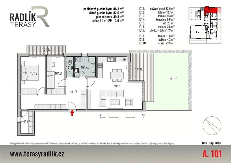 Hledáte klidné bydlení jen kousek od Prahy, kde si můžete užít prostor, soukromí a kontakt s přírodou? Tento moderní byt 3+kk by mohl být přesně pro vás. Nabízím byt o velikosti 86,3 m² s prostornou terasou 35,5 m² a balkonem 4,3 m², které výrazně rozšiřují obytný prostor. Jsou ideálním místem pro ranní kávu, letní posezení s přáteli nebo klidné večery pod širým nebem. Dispozice bytu je promyšlená a velmi pohodlná, jelikož obytný pokoj s kuchyňským koutem navazuje přímo na terasu, zatímco ložnice a pokoj mají vstup na společný balkon. Byt tak nabízí maximální komfort pro každodenní život i dostatek soukromí. Součástí je také sklepní kóje o velikosti 3 m² pro uložení věcí, které nepotřebujete mít neustále po ruce. Komfort bydlení dále zvyšují elektrické zatemňovací žaluzie a podlahové topení. Byt se nachází v moderním nízkopodlažním cihlovém domě s výtahem, který splňuje nároky na současné bydlení. Stavba je zařazena do energetické třídy B – velmi úsporná Dům je součástí rezidenčního projektu zasazeného do klidného a zeleného prostředí. Veškerou občanskou vybavenost najdete v centru, přičemž hned naproti domu se nachází Billa. Projekt je realizován v několika etapách a nabízí bytové jednotky různých dispozic. Tedy vhodné jak pro vlastní bydlení, tak jako investici. Lokalita Radlík zaujme kombinací blízkosti přírody a výborné dostupnosti do Prahy. K bytu je možné dokoupit vnitřní parkovací stání za 488 000 Kč, které není součástí kupní ceny. Pokud vás nabídka zaujala, neváhejte mě kontaktovat. Rád vás tímto bytem osobně provedu.
