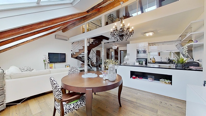 Hledáte pro sebe, nebo na investici, reprezentativní mezonetový byt s terasou v luxusní rezidenční čtvrti v centru Prahy, v blízkosti parků? Pak Vám exklusivně nabízím ke koupi moderní, slunný a tichý byt 3+KK (112 m2) s terasou (9,5 m2) do klidného vnitrobloku. Nachází se v nejvyšším 6. patře zrekonstruovaného klasicistního bytového domu s výtahem na Praze 2 - Novém Městě. Tento impozantní byt s orientací na V a Z, byl celý navržen. architektem v italském designu. Má vestavěné 2. patro, ve kterém se nachází ložnice a prostorná koupelna s masážní vanou s osvětlením a toaletou. Prvnímu patru dominuje velký obývací pokoj s designovým schodištěm v kombinaci dřevo/kov a s moderním kuchyňským koutem s veškerými zabudovaným elektrospotřebiči. Obytná část je oddělena osvětleným pultem s kamennou deskou (Technistone). Z obývacího pokoje se vstupuje do dalšího pokoje s rozsáhlou skříňovou sestavou; další koženou sedačkou, relaxačním koutem a vstupem na terasu. Ve spodním patře se dále nachází druhá prostorná koupelna se sprchovým koutem, dvěma umyvadly a pračkou. Je zde rovněž samostatné WC s malým rohovým umyvadlem. Celý byt je prosvětlen atypickými ateliérovými střešními okny a zútulňují ho původní dřevěné trámy. Ve všech místnostech jsou velké vestavěné úložné prostory, dřevěné podlahy a v koupelnách a na WC je dlažba s podlahovým vytápěním. Příjemné klima zde zajišťují 3 klimatizační jednotky. Vytápění a ohřev vody obstarává plynový kotel značky Junkers. Byt má domácí telefon s video-kamerou umístěnou u vchodu. Tento stylový byt se nabízí včetně kompletního vybavení a luxusního italského nábytku a osvětlení (viz. aktuální fotodokumentace), takže je možné se ihned nastěhovat, nebo ho pronajímat. Lokalita, kde se byt nachází, je uprostřed komerčního centra Prahy s výbornou dostupností do všech jejích částí buď ze stanice metra I. P. Pavlova, nebo ze zastávek tramvají autobusů, které jsou v odchozí vzdálenosti do cca 5 min.. Hlavní vlakové nádraží je vzdálené 2 stanice metra. Pro relaxaci a venkovní sporty jsou poblíž parky Folimanka a Grébovka. Tuto nemovitost je možné financovat z vlastních zdrojů, nebo hypotečním úvěrem, který Vám rádi zdarma zajistíme za nejlepších podmínek na trhu u Vámi preferovaného finančního ústavu. Vřele doporučuji prohlídku, kterou Vám mohu zaslat i ve virtuální podobě.