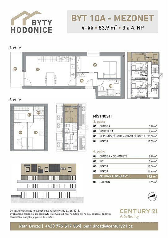 Ideální byt pro rodinné bydlení v obci Hodonice, která je největší vesnicí na okr. Znojmo! Prodej moderního mezonetového bytu 4+kk v Hodonicích, situovaný v Jihomoravském kraji v okrese Znojmo, na ulici Panská. Tato lokalita nabízí klid a pohodu zařazenou ve vesnickém prostředí, přičemž v blízkosti nechybí ani veškerá občanská vybavenost. Bytový dům je navržen jako čtyřpodlažní s výtahem, kdy podzemní podlaží bude sloužit pro parkování. Dům je vkusně zasazený do terénu a poslední patra zaručují krásný výhled do okolní krajiny. Souhrnný popis: Celkem bytů 1. etapy: 14 bytů Dispozice: 1+kk až 4+kk Uvedený byt: 10A, III. + IV. NP, podlahová plocha vč. balkonu 89,8 m2, užitná plocha bytu 83,9 m2 + 5,9 m2 balkon K bytu je možnost dokoupit: parkovací stání venkovní / garážové podzemní = 224 000 Kč vč. DPH sklepní kóje = 39 200 Kč vč. DPH PENB: B podlahové teplovodní vytápění pomocí centrálního tepelného čerpadla příprava na klimatizaci zvýhodněné nabídky dodání a montáže kuchyňské linky přímo od investora balkon bytu není zasklený, ale jeho rozloha umožňuje pohodlné sezení v teplých měsících. Byt je situován ve zděné budově, což zajišťuje dobré izolační vlastnosti a stálý komfort pro bydlení nový majitel má možnost využívat výtah v domě, což je velké plus pro pohodlnější přístup. Hypotéka na tento byt je možná, což může usnadnit financování pro potenciální kupce. Ve standardním provedení každého bytu jsou laminátové podlahy EGGER, obklady a dlažby v koupelně a na toaletě vč. sanity (sprchové kouty s odtokovým žlábkem WalkIn, WC, umyvadlo, baterie, zrcadlo s LED podsvícením), interiérové dveře, bezpečnostní vstupní dveře a okna s trojskly. Největší obec na okrese Znojmo nabízí pro své občany všechno, co můžete očekávat od moderní obce, která kulturně i společensky žije. Vinařská obec Hodonice leží na jižní Moravě v okrese Znojmo. Obec se rozkládá asi 10 kilometrů východně od Znojma a přibližně 11 kilometrů severně od rakouských hranic. Tato oblast je v těsné blízkosti turisticky atraktivního Národního parku Podyjí. Obec je dobře dopravně dostupná jak vlakem tak autobusem. Leží na hlavní silnici vedoucí ze Znojma na hraniční přechod Hevlín. Občané i turisté zde disponují dobrou sociální a občanskou vybaveností (praktický lékař, mateřská školka, DPS, kulturní dům, knihovna, sportovní areál, pošta, atd.). Celým průběhem financování rádi provedeme např.: prodáváte byt/dům a chtěli byste koupit nový byt? Víme, jak na to! Budu se moc těšit na vaše zavolání a osobní schůzku!