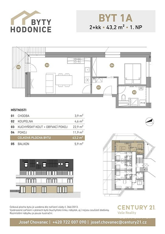 Ideální investiční byt v obci Hodonice, která je největší vesnicí na okr. Znojmo! Prodej moderního bytu 2+kk v Hodonicích, situovaný v Jihomoravském kraji v okrese Znojmo, na ulici Panská. Tato lokalita nabízí klid a pohodu zařazenou ve vesnickém prostředí, přičemž v blízkosti nechybí ani veškerá občanská vybavenost. Bytový dům je navržen jako čtyřpodlažní s výtahem, kdy podzemní podlaží bude sloužit pro parkování. Dům je vkusně zasazený do terénu a poslední patra zaručují krásný výhled do okolní krajiny. Souhrnný popis: Celkem bytů 1. etapy: 14 bytů Dispozice: 1+kk až 4+kk Uvedený byt: 1A, I. NP, podlahová plocha vč. balkonu 49,2 m2, užitná plocha bytu 43,3 m2 + 5,9 m2 balkon K bytu je možnost dokoupit: parkovací stání venkovní / garážové podzemní = 224 000 Kč vč. DPH sklepní kóje = 39 200 Kč vč. DPH PENB: B podlahové teplovodní vytápění pomocí centrálního tepelného čerpadla příprava na klimatizaci zvýhodněné nabídky dodání a montáže kuchyňské linky přímo od investora balkon bytu není zasklený, ale jeho rozloha umožňuje pohodlné sezení v teplých měsících. Byt je situován ve zděné budově, což zajišťuje dobré izolační vlastnosti a stálý komfort pro bydlení nový majitel má možnost využívat výtah v domě, což je velké plus pro pohodlnější přístup. Hypotéka na tento byt je možná, což může usnadnit financování pro potenciální kupce. Ve standardním provedení každého bytu jsou laminátové podlahy EGGER, obklady a dlažby v koupelně a na toaletě vč. sanity (sprchové kouty s odtokovým žlábkem WalkIn, WC, umyvadlo, baterie, zrcadlo s LED podsvícením), interiérové dveře, bezpečnostní vstupní dveře a okna s trojskly. Největší obec na okrese Znojmo nabízí pro své občany všechno, co můžete očekávat od moderní obce, která kulturně i společensky žije. Vinařská obec Hodonice leží na jižní Moravě v okrese Znojmo. Obec se rozkládá asi 10 kilometrů východně od Znojma a přibližně 11 kilometrů severně od rakouských hranic. Tato oblast je v těsné blízkosti turisticky atraktivního Národního parku Podyjí. Obec je dobře dopravně dostupná jak vlakem tak autobusem. Leží na hlavní silnici vedoucí ze Znojma na hraniční přechod Hevlín. Občané i turisté zde disponují dobrou sociální a občanskou vybaveností (praktický lékař, mateřská školka, DPS, kulturní dům, knihovna, sportovní areál, pošta, atd.). Celým průběhem financování rádi provedeme např.: prodáváte byt/dům a chtěli byste koupit nový byt? Víme, jak na to! Budu se moc těšit na vaše zavolání a osobní schůzku!