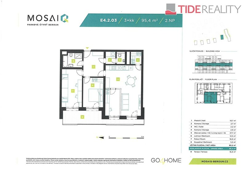 Klidné bydlení v zeleni na dosah Prahy! Dokončení v roce 2027. V nově vznikajícím rezidenčním projektu MOSAIQ Beroun Vám nabízíme byt 3+kk o podlahové ploše 95,4 m² s terasou o rozloze 16,4 m². Jednotka se nachází v 2. patře komorní, čtyřpatrové budovy E4. Západně orientovaný byt se skládá z obývacího pokoje s kuchyňským koutem (38 m²), 2 ložnic, koupelny s vanou, sprchou a toaletou, samostatné toalety, komory, spíže a předsíně. Dispozice bytu může být v rámci klientských změn upravena na 4+kk. Vstup na terasu z každé místnosti. Standardní vybavení bytů zahrnuje plovoucí podlahy, interiérové dveře s výškou 210 cm, moderní vybavení koupelen, okna s barevným rámem a izolačním trojsklem, přípravu na vnější žaluzie. V bytech budou moderní datové rozvody formou strukturované kabeláže a přípojka STA. V projektu bude využita smart technologie pro vytápění, která pracuje se dvěma tepelnými zdroji – tepelnými čerpadly a zemním plynem. Dostatečná kapacita parkovacích míst převážně v podzemních garážích, ale i venku. MOSAIQ Beroun parková čtvrť je velkoryse koncipovaný soubor bytových domů umístěných v zeleni, který nabídne široké rozpětí bytů od 1+kk po 5+kk s terasami, balkony či předzahrádkami. Novou obytnou čtvrť ohraničují ulice Na Máchovně a Na Morákově, domy vyrůstají v mírném svahu, který se zdvihá k vrcholu Děd. Ústřední budovou je dům s věží, na který navazuje sestava příjemných čtyřpatrových domů v zeleni. Užijte si bydlení v blízkosti hlavního města s kompletním zázemím města Beroun a Křivoklátskem za humny. Obytný soubor MOSAIQ Beroun navazuje na stávající obytnou čtvrť jejíž součástí jsou i sportovní centra Eden, koupaliště Laguna a také tréninkové centrum fotbalové mládeže. V těsné blízkosti naleznete obchody, školy a školky. Beroun je skvělá lokalita v blízkosti hlavního města s přímým autobusovým, či vlakovým spojením do Prahy. Díky nedaleké dálnici jste na hranici metropole za méně než čtvrt hodiny. V případě zájmu o jinou dispozici bytu, či více informací, mě kontaktujte nebo si domluvte nezávaznou schůzku v naší pražské kanceláři.