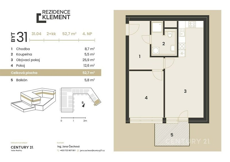 Krásný a slunný byt s balkonem v novostavbě Rezidence Klement na ul. Kotkova ve Znojmě může být Váš. Dispozice nabízeného bytu je 2+kk o výměře 52,7 m² plus 5,8 m² balkon. ⭐ nachází se ve 4. NP budovy A Rezidence Klement; ⭐ výhodou je prostorná vstupní chodba, která navazuje na koupelnu; ⭐ dále pokračujete do ložnice a poté z chodby do obývacího pokoje se vstupem na balkon a doleva ke kuchyňskému koutu; ⭐ podrobně se můžete podívat na půdorys bytu. Vysoký standard a hlavní přednosti bytu: ⭐ klimatizace v ložnici a v obývacím pokoji; ⭐ vinylová podlaha ve všech pokojích a v chodbě; ⭐ elektrické podlahové vytápění s termoregulací v každé místnosti vč. koupelny; Součástí nájmu je kuchyňská linka na míru včetně elektrospotřebičů, sedací souprava v obývacím pokoji, šatní skříň v chodbě, manželská postel vč. matrace a šatní skříň v ložnici, zařízená koupelna (umyvadlo, zrcadlo, sprchový kout s odtokovým žlabem a zástěnou, skříňka nad WC, el. žebřík). K bytu náleží sklepní kóje a vlastní parkovací stání v garáži, které je k dispozici za 1 500 Kč/měsíc. Měsíční nájemné 16 500 Kč, měsíční zálohy na služby a energie 4 500 Kč. Kauce ve výši 1 nájmu, tj. 16 500 Kč. Odměna RK ve výši 1 nájmu + DPH, tj. 19 965 Kč. Poloha domu těží z blízkosti centra Znojma, Vídeňské třídy s kvalitní dostupností směrem Vídeň a Brno. Veškerá občanská vybavenost je v dosahu 510 minut, ať už jízdy autem či pěšky v těsné blízkosti jsou nákupní domy Albert nebo Lidl, autobusové a vlakové nádraží, ale i základní a mateřská škola. Za pár minut můžete sejít také k řece Dyji, kde je nejen krásná procházka malebným údolím, ale také pěkný pohled na historické jádro Znojma, který Vás nikdy neomrzí. Na své si zde přijdou milovníci cyklo i vinařské turistiky. PENB je v kategorii B velmi úsporná. Byt je připraven k nastěhování. Pro více informací a prohlídku bytu mě neváhejte kontaktovat.