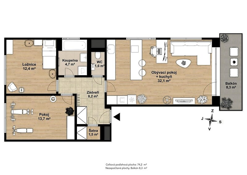 Moderní 3+kk s terasou v novostavbě 2024 Hledáte moderní bydlení v klidné lokalitě, kde máte přírodu doslova za rohem? Právě pro vás mám tento útulný byt o dispozici 3+kk v novostavbě z roku 2024 ve městě Zásmuky. Byt o výměře 73 m² se nachází ve 3. patře (4. nadzemní podlaží) a nabízí velmi příjemně řešený prostor. Dominantou je obývací část s designovou kuchyní, která dodává celému bytu moderní a elegantní charakter. Velkým benefitem je terasa o velikosti 8 m², ideální pro ranní kávu nebo večerní relax. Komfort bydlení zajišťuje podlahové vytápění v celém bytě a také rekuperace vzduchu, díky které máte neustále čerstvý vzduch bez nutnosti větrání. K bytu dále náleží: venkovní parkovací stání sklepní kóje (1,3 m²) Lokalita je jedním z hlavních lákadel – přímo vedle domu se nachází Zásmucká bažantnice, ideální místo pro procházky, sport nebo odpočinek v přírodě. Zásmuky nabízí kompletní občanskou vybavenost a zároveň skvělou dostupnost – do Prahy se dostanete do 1 hodiny. Pokud hledáte moderní byt bez nutnosti dalších investic, rád vám ho osobně představím.