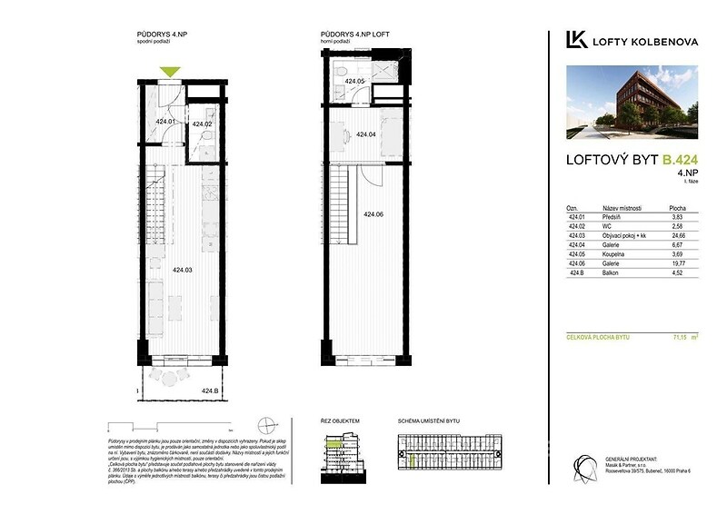 Moderní nadstandardní loftový byt o dispozici 3+kk s celkovou výměrou 71 m2 včetně balkonu. Byt se nachází ve 4. NP budovy. Byt je vybaven: klimatizací rekuperací podlahovým topením předokenními žaluziemi K bytu je možné přikoupit garážové zakladačové stání (495 000 Kč). Tento developerský projekt získal ocenění jako uznání za nejlepší stavbu využívající stávající objekt v bývalé průmyslové lokalitě. Jedná se o objekt, který díky revitalizaci a rekonstrukci bývalé továrny ČKD, se proměnil v moderní designové bydlení. Developer do 3. patra v bytech zachoval původní prvky z továrny, jako jsou například trámy a krakorce. Od 4. patra se jedná o novostavbu. V projektu můžeme najít byty od 1+kk až po 6+kk. Skvělá dopravní dostupnost, kde se před domem nachází zastávka tramvaje a metro Kolbenova 300 m od objektu. Přímo naproti je komplex Pragovka, nabízející jak kulturní, sportovní tak kulinářské vyžití. Skoro za rohem se nacházejí obchodní centra jako Fénix a Galerie Harfa. Pro fanoušky sportovních zápasů a velkých koncertů ideální bydlení v blízkosti O2 arény a zároveň blízkosti přírody jako Klíčovské sady. Byt je k dispozici ihned, pro více informací o objektu a jiných dispozic bytů/ateliérů přímo od developera mě prosím kontaktujte.