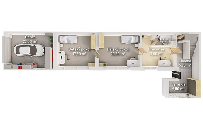 Na přelomu 19. a 20 století zde stálo pouhých pět domů. Dnes je „Pěťák“, neboli Pětidomí celou čtvrtí s ambicí stát se lokalitou s nejlepší dopravní dostupností do centra města. Zda nyní trochu tápete, zadejte do vyhledávače Tunel Pětidomí. Pokud hledáte rodinný dům s docházkovou vzdáleností do centra města, věříme, že se Vám naše nabídka bude líbit. Nabízíme k prodeji rodinný dům s garáží o zastavěné ploše 179 m2 a zahradou o výměře 309 m2 v ulici Reinerova v Českých Budějovicích. • rodinný dům s garáží a zahradou • celková výměra pozemku 488 m2 • dvě obytná podlaží a suterén • docházková vzdálenost do centra Českých Budějovic • výborné napojení na Zanádražní komunikaci s přímým nájezdem na dálnici D3 • budoucí Tunel Pětidomí propojí ulice Dobrovodská a Mánesova Dům je dispozičně řešen jako stavba o dvou nadzemních a jedním podzemním podlaží. Na pozemek vstupujeme z ulice Reinerova a vjezd do garáže je z ulice Dienzenhoferova, přičemž z garáže (24 m2) vedou dveře přímo do zahrady domu. Do domu vstupujeme po krátkém schodišti do velké vstupní chodby. Chodba zajišťuje vstup do prvního obytného podlaží, suterénu a její součástí je schodiště vedoucí do druhého obytného podlaží. Dispoziční řešení obytných podlaží: 1.NP – pracovna (11,80 m2), koupelna (3,10 m2), dětský pokoj (20,50 m2), dětský pokoj (17,90 m2) 2.NP – kuchyně (10,40 m2) s přímým vstupem na terasu (15,50 m2), obývací pokoj (21,60 m2), ložnice (16,40 m2). Koupelna (4 m2) a WC místnost je přístupna z haly se schodištěm ve 2.NP Celý dům je pak podsklepen. Velkou výhodou je skutečnost, že se jedná o krajní pozemek. Jeho oplocení je z jedné části řešeno plnou zdí a z druhé vzrostlou zelení, takže zahrada nabízí dostatek soukromí. Stavba samotná je udržovaná, však ve stavu, který odpovídá jejímu stáří. Tato skutečnost otevírá možnosti k celkové rekonstrukci domu, jejímž výsledkem bude moderní rodinný dům nacházející se ve stabilizované lokalitě s výbornou dopravní dostupností a občanskou vybaveností. Prohlídku doporučujeme a těšíme se na Vás.