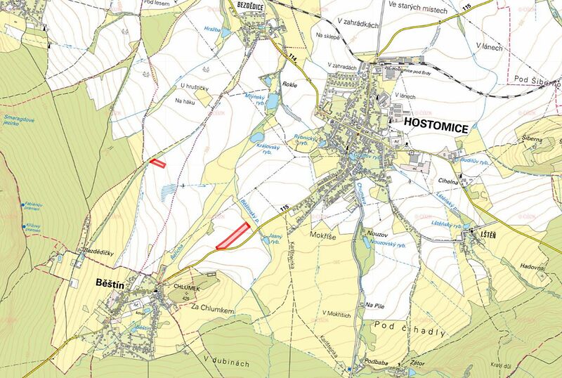Nabízím k exkluzivnímu prodeji dva hospodářské celky nacházející se v katastrálních územích Bezdědice u Hostomic a Hostomice pod Brdy, okres Beroun. Pozemky leží v rovinaté krajině s výbornou dostupností do Prahy. První celek se nachází v k.ú. Bezdědice u Hostomic a je zapsán na listu vlastnictví č. 725. Jedná se o výlučné vlastnictví, prodávají se parcely: parc. č. 140/64 orná půda o výměře 4 611 m parc. č. 141/12 vodní plocha o výměře 58 m Druhý celek je situován v k.ú. Hostomice pod Brdy, na listu vlastnictví č. 634. Opět se jedná o výlučné vlastnictví. Předmětem prodeje jsou parcely: parc. č. 1645/58 trvalý travní porost o výměře 91 m parc. č. 1646/26 orná půda o výměře 19 835 m parc. č. 1648/12 ostatní plocha o výměře 61 m Celková výměra všech pozemků činí 24 656 m, z toho 24 446 m je orná půda. Na pozemky je aktuálně uzavřen pacht s AGRONA RPETY s.r.o. Pro více informací mě kontaktujte telefonicky nebo e-mailem. Pozemek nabízím k exkluzivnímu prodeji v zastoupení vlastníka. Cena je uvedena včetně provize. Majitel si vyhrazuje právo vybrat kupujícího na základě nabídky.