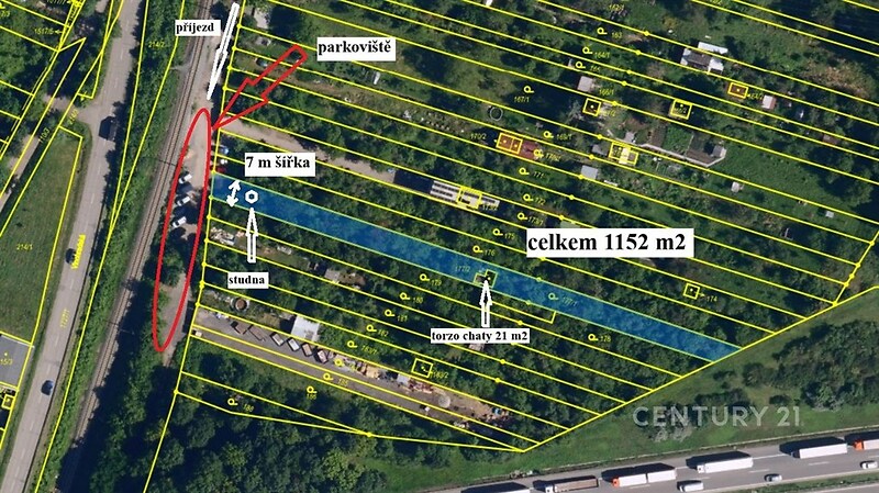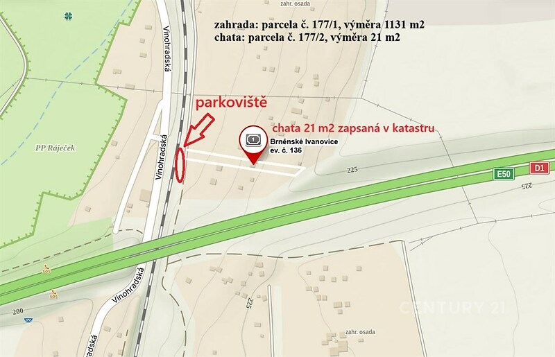 Nabízím k prodeji zahradu s chatkou o výměře 1 152 m² v Brně, katastrální území Brněnské Ivanovice, parcela č. 177/1. Pozemek má přibližnou šířku 7 m, je mírně svažitý a částečně oplocený. Přístup je pohodlný – parkování je možné přímo u pozemku. Zahrada je vyčištěna od náletových dřevin. Na pozemku se nachází torzo chaty č. ev. 136 o zastavěné ploše 21 m², které je určeno k demolici nebo nahrazení novou stavbou určenou k rekreaci o max. zastavěné ploše 40 m². Na pozemek není dotažená elektřina. Výhodou je kopaná studna min. 3 m hluboká a také vzrostlé ovocné stromy: meruňky, hruška, mandloň, blumy, třešeň, ořešáky. Pozemek je vhodný pro: zahradničení pěstování ovoce a zeleniny, rekreační využití, skleník, altán, kůlna, chata o ZP max 40 m² (max 1 podlaží + podkroví). Je však potřeba počítat s tím, že lokalita není zcela klidná – cca 20 m od pozemku vede železniční trať a přibližně 50 m od pozemku dálnice. V případě zájmu o více informací či o prohlídku kontaktujte makléřku.