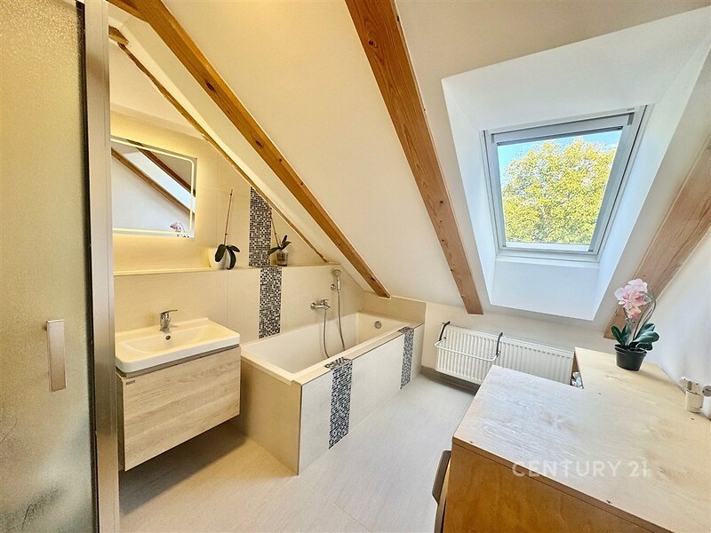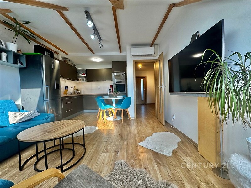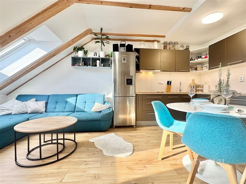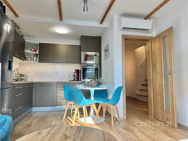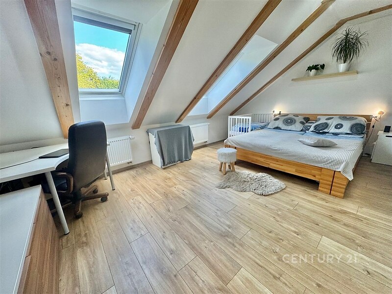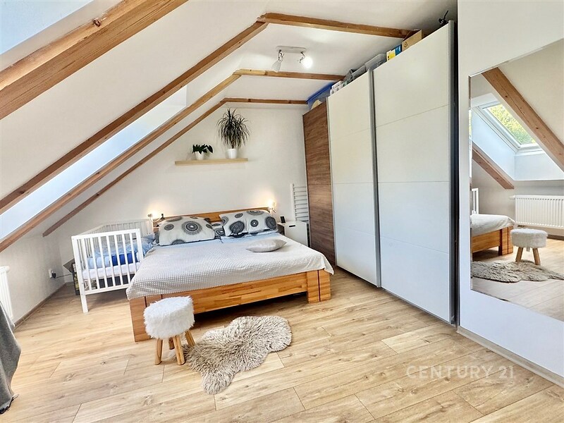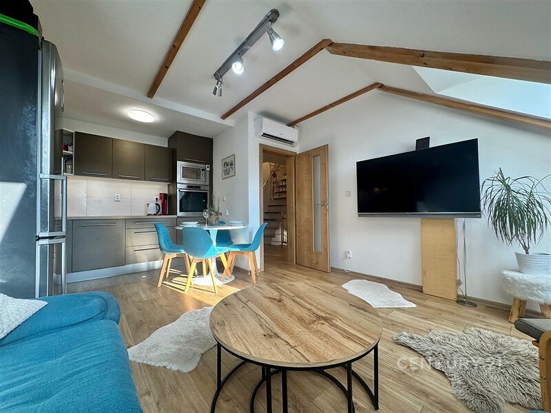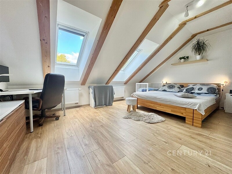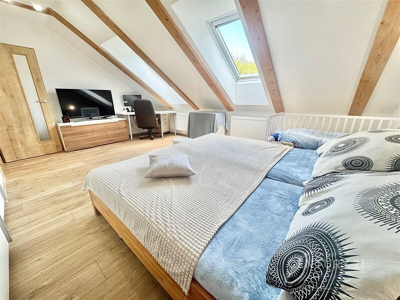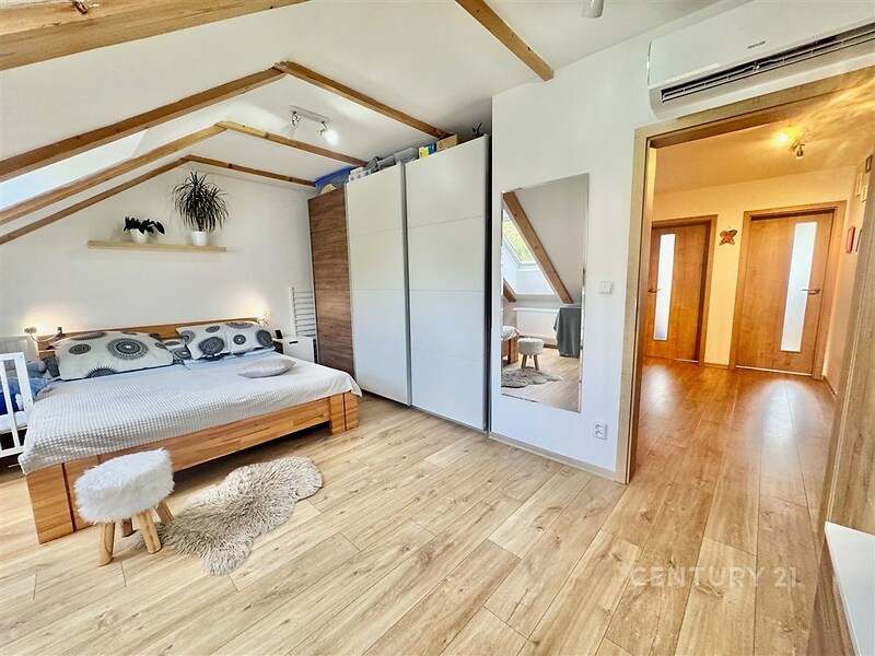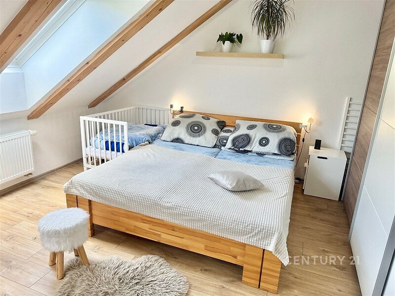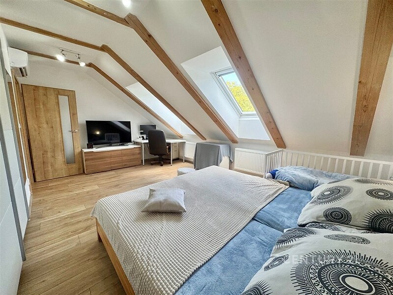 Nabízíme bytovou jednotku v OV o dispozici 3+kk (4+kk) v obci Jinačovice, CP 113,1 m2, umístěná v 3.NP/4, v cihlovém domě, skladový prostor ve 4.NP (19,6 m2 – užíván jako další pokoj), sklep 2,3 m2, parkovací místo před domem v ceně. Jedná se o příjemný, prostorný, podkrovní byt v menším rodinném bytovém domě, novostavba z roku 2016, mezonetový, situovaný v 2. (schodiště), 3. (byt 3+kk) a 4. NP (skladový prostor – další pokoj). Obytná plocha bytu 91,2,56 m2 (3.NP), skladový prostor 19,6 m2 (4.NP) užíván jako další pokoj, sklep 2,3 m2 (1.NP), parkovací stání před domem. Byt je vybaven kuchyňskou linkou na míru včetně spotřebičů. V koupelně vana i sprchový kout, střešní okno a podlahové vytápění. Interiérové dveře vč. obložek v dekoru dub. Podlahy vinylové. Okna střešní plastová vč. rolet s UV ochranou. Klimatizace Sinclair ve všech místnostech. Vytápění domu plynový kondenzační kotel Baxi pro všechny 3 bytové jednotky. Ohřev teplé vody zajišťuje el. bojler v bytě. Dům po rekonstrukci (plastová okna, zateplení, fasáda, střecha). Nízké náklady na provoz bytu.