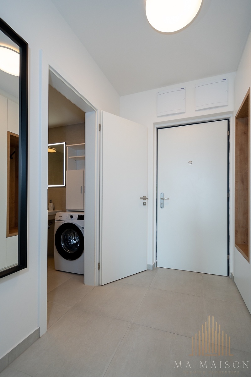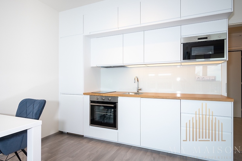 Nabízíme dlouhodobý pronájem moderně zařízeného bytu o dispozici 1+kk a výměře 37,58 m² s balkonem. Byt se nachází v nedávno zkolaudované novostavbě v lokalitě Praha Žižkov v projektu Byty Na Vackově. Byt je umístěn v 5. NP a sestává se z předsíně s vestavěnou šatní skříní a zrcadlem, koupelny s vanou, toaletou, umyvadlem se skříňkou a zrcadlem, otopným žebříkem, pračkou, dále z obytné místnosti spojené s kuchyňským koutem a z balkonu. Kuchyňská linka je kompletně zařízena vestavěnými spotřebiči v podobě lednice s mrazákem, mikrovlnné trouby, myčky, varné desky, trouby a digestoře. Dále je k dispozici jídelní stůl a 4 jídelní židle. Obytná část je vybavena sedací soupravou a moderní manželskou postelí včetně roštů a pohodlnou matrací. V bytě jsou k dispozici okenní interiérové rolety, které dokáží místnost kompletně zastínit. K dispozici sklepní kóje pro uskladnění jízdních kol, lyží a dalšího vybavení. Měsíční náklady bytu činí 4.650 Kč včetně pojištění domácnosti a odpovědnosti. El. energie se převádí na nájemníka. O převod se kompletně postaráme. Odhad měsíčních záloh cca 1.100 Kč / měsíc. Vratná kauce: 40.000 Kč Provize RK: 1x měsíční nájem + 21 % DPH. V rámci procesu rezervace provádíme lustraci v bankovních a nebankovních registrech, solus apod. Nulový záznam podmínkou. K nastěhování od 1.2.2026 Vhodný maximálně pro 2 osoby.