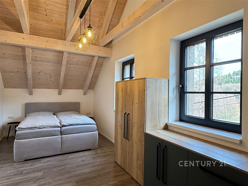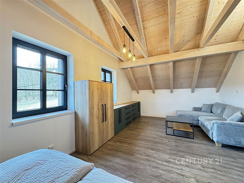 Nabízíme k dlouhodobému pronájmu prostorný a prakticky řešený byt 1+1 o rozloze 44 m², který se nachází ve druhém nadzemním podlaží novostavby se 4 byty, v unikátní lokalitě Hluboké, na okraji lesa. Byt je kompletně vybaven nábytkem a novou kuchyňskou linkou. Interiér tvoří obývací část vybavená postelí, skříněmi a pohovkou, na kterou navazuje kuchyňský kout s linkou a spotřebiči. O tepelný komfort se po celý rok stará moderní tepelné čerpadlo napojené na podlahové vytápění. Součástí bytu je koupelna se sprchovým koutem a toaletou. Nájemníci mohou využít prádelnu, ve které má každý byt svojí pračku se sušičkou. K využití je zahrada u domu, na které se dokončují terénní úpravy. K bytu náleží 2 parkovací stání přímo u objektu. Toto bydlení představuje ideální volbu pro ty, kteří hledají moderní standardy a bezprostřední kontakt s přírodou zcela mimo městský ruch. Nájemné 20.000, Kč včetně teplé a studené vody a tepla, elektřina záloha 1.000, Kč, jistota 2 měsíční nájmy, provize RK 15.000, Kč. Obchody, MHD a vlaková stanice Pilínkov jsou vzdálené 1,5 km od domu.