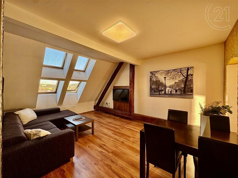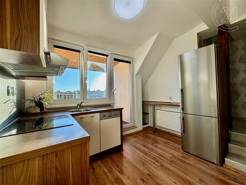 Nabízíme k prodeji moderně zrekonstruovaný byt s klimatizací o dispozici 3+kk na ulici Tržní 6 v Brně Černovicích. Tento byt se nachází v 6. patře cihlového domu bez výtahu původně z roku 1918. Dům prošel kompletní rekonstrukcí v roce 2015. Renovace střechy pak v roce 2023. Dům je zateplený s dřevěnými střešními okny. Svojí neobvyklou dispozicí a rozložením ve dvou patrech nabízí neotřelý prostor v blízkosti řeky Svitavy a dochozího Centra Brna. Interiér bytu má prvky přiznaných krovů a dominuje mu centrální stěna s prostorovou povrchovou úpravou a schodištěm do patra. Byt má přistřešenou terasu s orientací na J. Terasa směřuje do klidného vnitrobloku kam má majitel přístup. Ložnice a obývací pokoj v prvním podlaží bytu jsou orientovány na S s krásným výhledem na Židenice, Vinohrady a Líšeň. Na tomto patře je i kuchyně s terasou a toaleta s umyvadlem. Druhé patro je přístupné po dřevěném otevřeném schodišti z kuchyně. Zde je v zádveří ukrytý plynový kondenzační kotel s úložným prostorem na chodbě. Z chodby je vstup do ložnice a koupelny se sprchovým koutem, pračkou a dostatkem prostoru. Náklady měsíčně za rok 2O24 celkem 5.012 Kč: SVJ 802 Kč Elektřina 1.820 Kč Plyn 2.390 Kč Parkování je možné v modré zóně C na ul. Klíčové nebo Zvěřinové. Přímo před domem se dá bezpečně zastavit a vyložit nákup. Pro více informací a prohlídku kontaktujte makléře Petra Vyskočila.