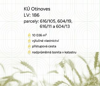 Nabízíme k prodeji zemědělskou půdu v okrese Prostějov, konkrétně v katastrálním území Otinoves. Jedná se o pozemky parc. č. 616/105, 604/19, 616/11 a 604/13, zapsané na LV 186. Všechny tyto pozemky jsou nabízeny k prodeji do výlučného vlastnictví. Celková výměra nabízených pozemků činí 10 036 m, z čehož dle katastru nemovitostí 7 132 m tvoří orná půda a 2 904 m trvalý travní porost. V současné době AGRO Rozstání užívá pozemky jako ornou půdu. Pěstují tržní plodiny jako je řepka ozimá, pšenice ozimá, ječmen jarní, oves a pro oblast typické žito ozimé a triticale. Pozemky se nacházejí přímo u cesty, což zajišťuje snadnou obslužnost zemědělské techniky i přístup v průběhu celého roku. Jsou situovány v protilehlých zemědělských blocích. Další významnou předností je nadprůměrná bonita půdy v rámci tohoto katastrálního území. Pro více informací mě neváhejte kontaktovat telefonicky nebo e-mailem. Nabídku realizuji v zastoupení vlastníka. Pokud vás tato konkrétní nabídka nezaujala, přidejte se k programu MojePole Plus a získejte pravidelné nabídky přímo do vaší e-mailové schránky. Stačí vyplnit nezávaznou poptávku na našich webových stránkách. Majitel si vyhrazuje právo vybrat kupujícího na základě nabídky.