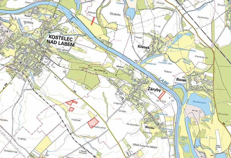 Nabízíme k prodeji zemědělskou půdu v žádaných okresech Praha-východ a Mělník. V katastrálním území Záryby (okres Praha-východ) jsou pozemky zapsány na LV 983 a jedná se o parcely č. 447/1, 337/1, 447/2, 807 a 442/1, které jsou vedeny jako orná půda. V katastrálním území Kostelec nad Labem (okres Mělník) jsou pozemky zapsány na LV 1112 a jedná se o parcelu č. 1400/32 s druhem trvalý travní porost a parcelu č. 1399/23 s druhem orná půda. Území je součástí úrodné a rovinaté Polabské nížiny. Celková výměra pozemků činí 82 106 m, z toho je k prodeji 24 776 m, přičemž 23 680 m tvoří orná půda a 1 096 m trvalý travní porost. Chcete-li získat více informací, neváhejte mě kontaktovat telefonicky nebo e-mailem. Pozemky nabízím k prodeji v zastoupení vlastníka. Majitel si vyhrazuje právo vybrat kupujícího na základě nabídky.