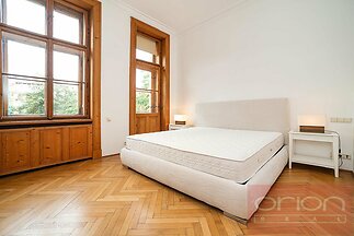Nabízíme k pronájmu atypický luxusní byt 5+1 ve 4. patře secesního domu s výtahem, který se nachází v atraktivní rezidenční čtvrti Prahy 2 - Vinohrady naproti budově Vinohradského divadla, jen pár metrů od Náměstí Míru. Plně zařízený byt s celkovou plochou 171 m² nabízí vstupní halu, prostorný obývací pokoj se vstupem na balkon, kompletně vybavenou kuchyň, jídelnu, 3 ložnice, 2 koupelny (jednu s vanou a jednu se sprchou + toaletou), samostatnou toaletu a technickou místnost s pračkou a sušičkou. K vybavení bytu patří dřevěné parkety a mramorové obklady v koupelnách, internet, satelit. Lokalita s výbornou dopravní dostupnosí, občanskou vybaveností, v blízkém okolí je množství restaurací, kaváren, bister, obchodů a dalších služeb. Pár kroků od domu jsou stanice tramvají, autobusů a metra. Václavské náměstí či park Riegrovy sady jsou jen několik minut chůze od domu. Nájemné 5500 EUR měsíčně, možnost pronájmu parkovacího stání v podzemní garáži za extra 200 Eur za měsíc.