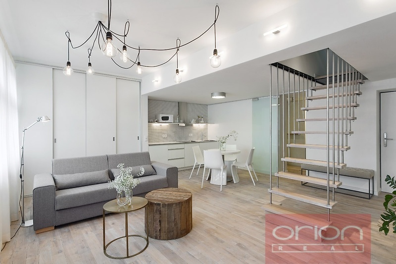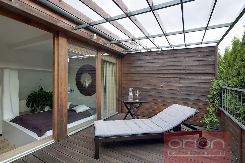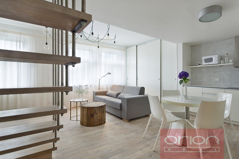Nabízíme k pronájmu mezonetový byt 2+kk s terasou v 5. patře zrekonstruovaného secesního domu z 19. století v Praze 5. V domě je výtah. Zařízený byt o rozloze 53 m2 nabízí v horním patře ložnici s dvoulůžkem a vstupem na terasu. V dolním patře je obývací pokoj s rozkládací sofa spojený s kuchyňskou a jídelní částí s vybavenou kuchyňskou linkou, stolem a židlemi, koupelna se sprchovým koutem a samostatná toaleta. K vybavení apartmánu patří TV, SAT, WIFI a klimatizace. Lokalita s výbornou dopravní dostupností autem i MHD, stanice metra Anděl je 5 minut tramvají, tramvajová zastávka U Zvonu je pár metrů od domu. V blízkosti se nachází restaurace, obchody a oblíbený park Petřínské sady. Součástí nájemného je wifi + úklid 1x týdně s výměnou lůžkovin a ručníků.