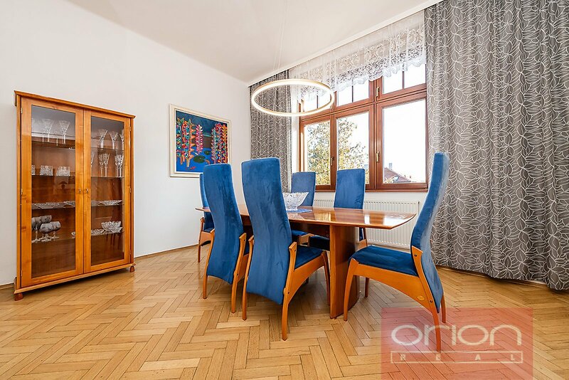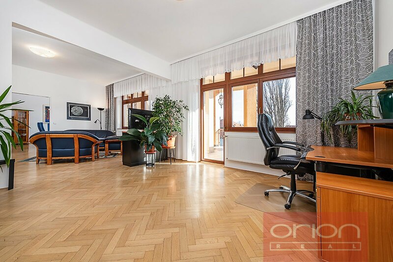 Nabízíme k pronájmu prostorný, zařízený byt o ploše 131 m² s terasou 21 m², situovaný ve 2. patře rezidenční vily s krásnou zahradou v prestižní vilové čtvrti Hanspaulka v žádané lokalitě Praha 6 – Dejvice. Dispozice bytu nabízí vstupní halu, plně vybavenou kuchyň se všemi spotřebiči, jídelnu částečně propojenou s prostorným obývacím pokojem (42 m²) s krbem a se vstupem na velkou terasu, dvě ložnice – hlavní ložnice má vlastní koupelnu se sprchou a toaletou, dále druhou koupelnu s vanou, další samostatnou toaletu, a komoru. Na podlahách jsou parkety a dlažba. K vybavení bytu patří dostatek úložného prostoru díky vestavěným skříním a komoře, centrální vysavač, plynové kotel Vaillant, pračka, zabezpečovací systém. V ceně nájmu je zahrnuta garáž pro 1 vozidlo, kde je také úložný prostor. Nájemci je k dispozici užívání krásné, udržované zahrady se zahradním sezením. Vila se nachází v klidné rezidenční části Praha 6 – Hanspaulka s kompletní občanskou vybaveností v okolí: restaurace, kavárny, obchody i obchodní centrum Bořislavka Centrum. V blízkosti jsou také mezinárodní školy International School of Prague (ISP), Prague British International School (PBIS) a Riverside School, stejně jako tenisové kurty a další sportoviště. Výborná dopravní dostupnost – 5 minut chůze na stanici tramvaje a autobusu s přímým spojením na metro Bořislavka nebo do centra. Autem přibližně 15 minut do centra města, na Letiště Václava Havla Praha či na Pražský okruh. Byt nabízí komfortní bydlení v klidném prostředí s rychlou dostupností do centra města.