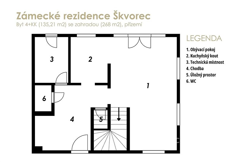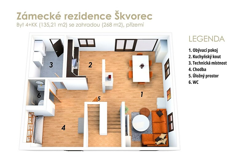 Nabízíme vám jednotku o dispozici 4+kk s podlahovou plochou 135 m², který se nachází v nově vznikajícím rezidenčním projektu Zámecké rezidence Škvorec. K bytu náleží zahrada o velikosti 268 m², garážové stání a venkovní parkovací místo. Byt je součástí domu o třech jednotkách a nabízí komfortní bydlení s atmosférou rodinného domu, s vlastním vstupem, soukromím a dostatkem venkovního prostoru. Dům je nízkoenergetický, navržený s ohledem na budoucnost. Je vybaven podlahovým vytápěním s možností regulace, vlastním tepelným čerpadlem a rekuperační jednotkou. Samozřejmostí jsou přípravy pro chytrou domácnost, kamerový a zabezpečovací systém, venkovní žaluzie a rolety, fotovoltaickou elektrárnu a dobíjecí stanici pro elektromobil. Prostor kuchyně je připraven tak, abyste si ji mohli navrhnout přesně podle svých představ. S realizací vám rádi pomůžeme. Dispozice 4+kk poskytuje dostatek prostoru pro rodinu i pohodlné zázemí pro práci z domova. Promyšlené uspořádání umožňuje oddělit obytnou a klidovou část, přičemž z hlavní obytné místnosti je přímý vstup na zahradu, která nabízí ideální místo pro relaxaci či posezení s rodinou a přáteli. Škvorec nabízí vynikající dopravní dostupnost do Prahy, vlakem jste na Masarykově nádraží přibližně za 35 minut. V obci najdete veškerou občanskou vybavenost, školku, školu, lékaře i menší obchody. Pro širší nabídku služeb lze využít nedaleké Úvaly nebo přímo Prahu. Okolí tvoří malebná příroda, ideální pro procházky, cyklistiku a volnočasové aktivity. S financováním vám rádi pomůžeme – nabízíme kompletní servis včetně vyřízení hypotečního úvěru. Pokud vás nabídka zaujala, neváhejte mě kontaktovat. Ráda Vás tímto bytem osobně provedu.