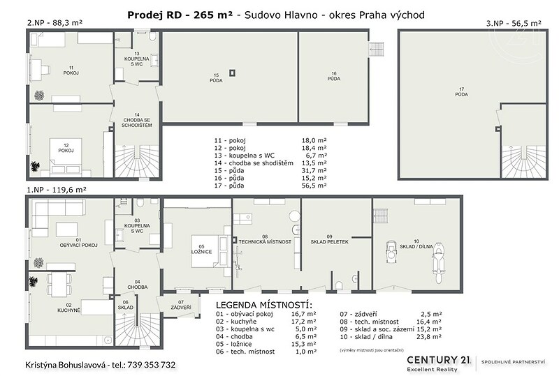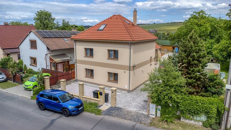 Nabízíme Vám ke koupi rodinný dům 4+kk o celkové užitné ploše 265 m² a výměrou pozemku 764 m² v obci Sudovo Hlavno, okres Praha – východ. Dům je po rekonstrukci, která proběhla v průběhu roku 2023 až 2025, tj. střecha z roku 2023 (tašky), částečné zateplení domu, zateplení střechy, plastová okna, nová elektřina, voda a odpady, fasáda, interiér atd. Druhé nadzemní podlaží není z části dodělané, zde by mohl být například další pokoj, ložnice, posilovna, pracovna apod. Ze 2.NP se po schodech dostanete do podkroví (3.NP), kde je rovněž ideální prostor pro vybudování dalšího pokoje. Dispozičně by mohl být dům řešen jakožto 6+kk. Na rodinný dům navazuje technická místnost, kde je kotel na pelety, uskladnění kol atd., dále sklad (je zde i WC a menší kuchyňka) a dílna. Na pozemku se nachází studna, zámková dlažba pro parkování automobilů, nové oplocení, příprava na pergolu či bazén, dřevník, skleník a venkovní sprcha. Vytápění domu je řešená kotlem na tuhá paliva, tj. pelety + příprava na elektrokotel, ohřev vody el. bojlerem Dražice, který je umístěn v koupelně, voda v kuchyni se ohřívá průtokovým ohřívačem, který je v technické místnosti pod schody. V obývacím pokoji se nachází krb s průduchem do chodby. Ještě se budou dodělávat venkovní vrata na pohon s dálkovým ovládáním. Obecní kanalizace, voda z vlastní studny, ale je možné se napojit na obecní vodovod (přípojka na pozemku), elektřina 230 – 400 V. V obci Sudovo Hlavno se nachází obchod s potravinami, hospůdka, dětské hřiště a autobusová doprava. Nejbližší MŠ, ZŠ a pošta v obci Kostelní Hlavno cca 1 km. Brandýs nad Labem – Stará Boleslav cca 11 km. V případě zájmu o prohlídku mne neváhejte kontaktovat.