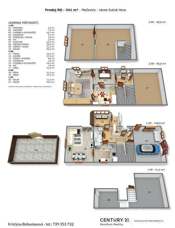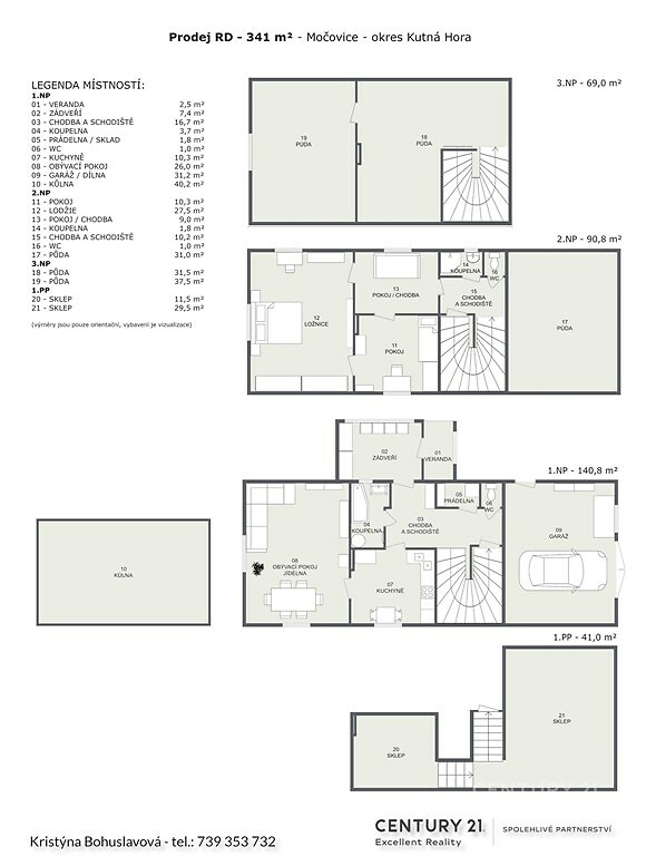 Nabízíme Vám ke koupi zděný rodinný dům 4+1 o celkové užitné ploše 341 m² a výměrou pozemku 1120 m² v obci Močovice u Čáslavi, okres Kutná Hora. Dům je určen k rekonstrukci, samostatně stojící, dvoupodlažní s půdním prostorem a částečně podsklepený. Zastřešení je provedeno sedlovou střechou. Pod střechou se nachází prostorná půda (3.NP). Součástí objektu je i nevytápěná garáž s menší půdou pro uskladnění věcí. Okna původní dřevěná, původní elektřina 230 – 400 V (pouze nový hlavní jistič), obecní vodovod a tlaková kanalizace, vlastní studna se třemi prameny (vydatná). Na pozemku stojí prostorná kůlna/dílna a dřevníky. Rodinný dům se nachází na velmi klidném místě, resp. na samotě u přírody. Město Čáslav se nachází pouze 2,5 km od obce Močovice a Kutná Hora cca 7 km. V obci je MŠ, obecní knihovna, obchod s potravinami, hospůdka a autobusová doprava. Na nemovitost byla podána žádost o dotaci programu z prostředků Modernizačního fondu Nová zelená úsporám, která byla již schválena s možností čerpání poskytnuté dotace. Pro více informací o schválené výši dotace sdělím na vyžádání. Dotace se vztahuje na optimální zateplení domu, tj. fasády, podlah, stropu, střechy atd., tepelné čerpadlo vzduch/vzduch nebo vzduch/voda pro vytápění a ohřev vody s podporou FV, fotovoltaické systémy pro výrobu el. energie, systém řízeného větrání se zpětným získáváním tepla a instalace dobíjecí stanice. K dispozici je i cenová nabídka na stavební práce zahrnující zateplení fasády, zateplení půdy, zateplení podlahy a výměnu oken. Objekt je bývalá staniční budova pro trať Čáslav – Močovice (4,2 km). Trať vznikla v letech 1881 až 1882 pro místní cukrovar. Zanikla částečně v roce 1965 po ukončení provozu v 60. letech. Trať sloužila primárně k dopravě cukrové řepy do cukrovaru v Močovicích, který byl v té době hlavním zdrojem nákladní dopravy na trati. V případě zájmu o prohlídku či o více informací mne neváhejte kontaktovat. Nemovitost lze financovat hypotečním úvěrem.