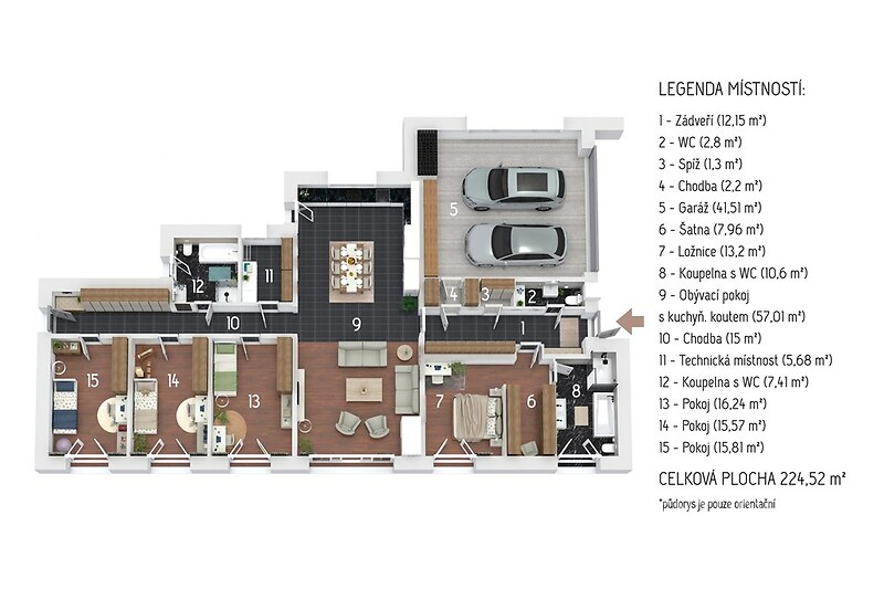 Nabízíme výjimečný přízemní dům navržený ve spolupráci architektů Ing. arch. Martina Náhlovského a Ing. arch. Lukáše Richtera ze studia MASTER DESIGN, kteří spojili moderní technologie, přírodní materiály a promyšlenou dispozici do harmonického celku. Objekt s dispozicí 5 + kk a užitnou plochou 224,5 m² stojí na pozemku o velikosti 1 000 m² v klidné části obce Děhylov. Dominantou je velkorysý obývací pokoj s kuchyní a jídelnou o rozloze 57 m², jehož atmosféru podtrhují designová kachlová kamna a přímý vstup na terasu se zahradním koupacím biotopem obklopeným skalkou. Vedle stavby se nachází vyhřívaný bazén s protiproudem a masážními tryskami, zastřešený elektricky ovládanou pergolou s boční clonou, která umožňuje využití i v chladnějším počasí. Na zahradě nechybí ani samostatná sauna – ideální místo pro relaxaci, klid a soukromí. V obytné části se nachází čtyři ložnice, tři koupelny, tři toalety, technická místnost, šatna, spíž a garáž o velikosti 41,5 m² s přímým vstupem. Interiér je proveden v nadstandardní kvalitě – žulové a dřevěné podlahy, omítky Weber, SDK podhledy a velká francouzská okna s trojskly, která propojují vnitřní a venkovní prostor a zajišťují dostatek denního světla. Všechna okna jsou opatřena bezpečnostní fólií. Každý detail byl zvolen s ohledem na estetiku i praktičnost, takže celek působí elegantně a přitom útulně. Stavba je realizována z cihelného systému HELUZ Family 50 2in1 s výbornou tepelnou izolací. O vytápění a ohřev vody se stará tepelné čerpadlo napojené na podlahové topení, nechybí rekuperace pro zdravé a úsporné větrání. Součástí je fotovoltaická elektrárna Solidsun o výkonu 19,8 kW s bateriovými úložišti Pylontech (14,2 kWh) a wallbox pro elektromobil. Plochá střecha je izolovaná EPS 150 S a hydroizolací DEKPLAN 76. Celý objekt chrání kamerový systém, alarm Paradox a je připraven na chytré řízení domácnosti. Koncept bydlení spojuje energetickou úspornost a částečnou soběstačnost. K dispozici je vlastní studna, domovní čistírna odpadních vod i obecní vodovod, což zajišťuje minimální náklady na provoz. Výroba elektřiny z fotovoltaiky s bateriovým úložištěm doplňuje systém udržitelného a ekologického fungování. Orientace na jihozápad zaručuje dostatek světla a tepla po celý den, terasa poskytuje klidné soukromí a příjemný výhled do zeleně. Ulice K Močidlům je tichá, s minimálním provozem, a patří mezi nejžádanější lokality v Děhylově. Obec leží mezi Ostravou a Opavou a nabízí kompletní občanskou vybavenost – školu, školku, obchod, restauraci i vlakové spojení. V okolí jsou cyklostezky, řeka Opava, Hlučínské jezero i rozsáhlé lesy ideální pro aktivní odpočinek i rodinné procházky. Tento dům nabízí prostor, klid i atmosféru, kterou nelze popsat – tu musíte zažít osobně. Domluvte si prohlídku a poznejte místo, kde se z pocitu domova stává skutečný zážitek.