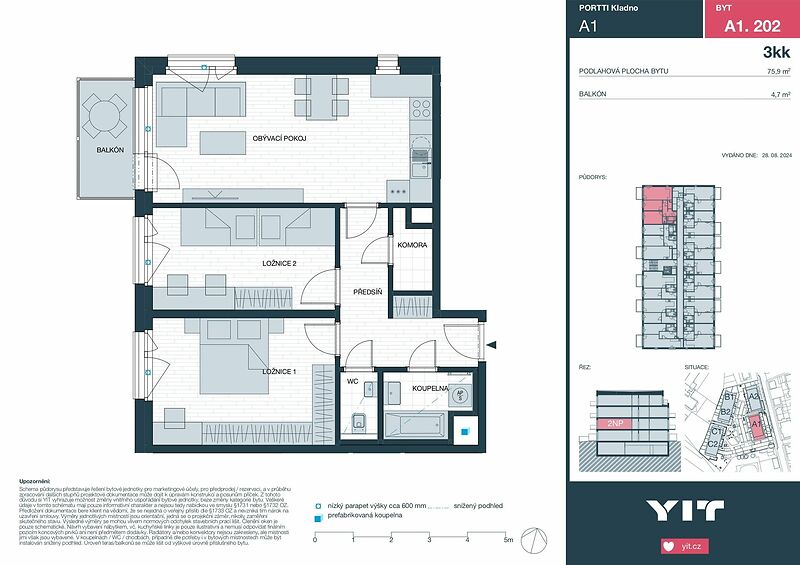 Nadstandardní bydlení v projektu PORTTI – moderní družstevní byt 3+kk s garážovým stáním a balkonem v klidné části Kladna Nabízím k prodeji exkluzivní družstevní byt o dispozici 3+kk v architektonicky nadčasovém rezidenčním projektu PORTTI, realizovaném renomovaným finským developerem YIT. Projekt je situován v širším centru města Kladno a představuje jednu z nejatraktivnějších novostaveb v lokalitě. Byt o celkové ploše 75,9 m² se nachází ve 2. nadzemním podlaží a díky rohové dispozici nabízí dostatek přirozeného světla i vysoký standard soukromí. Orientace do upraveného vnitrobloku se zelení zajišťuje klidné a harmonické bydlení mimo ruch města – jedna z nejžádanějších poloh v rámci celého projektu. K bytu náleží balkon o velikosti 4,7 m², ideální pro odpočinek i každodenní relaxaci. Samozřejmostí je sklepní kóje a komfortní garážové stání přímo v domě. Lokalita, která spojuje klid, zeleň i výbornou dostupnost Projekt se nachází v bezprostřední blízkosti prestižní vilové čtvrti Habešovna a nabízí kompletní občanskou vybavenost v docházkové vzdálenosti – školy všech stupňů, zdravotnická zařízení, úřady i široké možnosti sportovního vyžití. Významným benefitem je modernizované železniční spojení Kladno–Praha s novými zastávkami, přičemž nejbližší stanice se nachází přibližně 5 minut chůze od domu. Milovníci přírody a aktivního životního stylu ocení blízký lesopark s cyklostezkami vedoucími například k hradu Okoř či do oblasti Křivoklát. Stabilní investice i komfortní domov Nemovitost představuje ideální volbu jak pro vlastní bydlení, tak pro dlouhodobou investici. Lokalita vykazuje stabilní poptávku po nájemním bydlení, mimo jiné díky blízkosti škol a dobré dostupnosti do Prahy. Družstevní vlastnictví – efektivní a flexibilní řešení • bez nutnosti hypotečního financování a prokazování příjmů • splácení formou měsíční anuity • byt není evidován v katastru nemovitostí • po doplacení anuity (6 003 580 Kč, maximálně 30 let, možnost kdykoliv doplatit) možnost převodu do osobního vlastnictví • transparentní správa a kontrola podnájemních vztahů Družstvo zajišťuje stabilní a zkušený subjekt s více než 50letou tradicí. Cena Cena za převod družstevního podílu činí 3 350 000 Kč + anuita (aktuální výše anuity 6 003 580 Kč). Čas na vlastní realizaci interiéru Předpokládané dokončení bytu je na podzim 2026. Jednotka je připravena k finálnímu dokončení dle individuálních požadavků budoucího vlastníka (kuchyňská linka není součástí), což umožňuje vytvořit si bydlení přesně podle vlastních představ. Tato nabídka představuje výjimečnou příležitost pořídit si moderní bydlení v kvalitním projektu s dlouhodobou hodnotou. V případě zájmu o více informací nebo osobní konzultaci mě neváhejte kontaktovat.