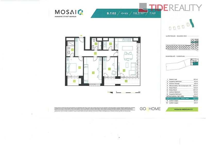 Najděte s námi nový domov v Berouně! Poklidné bydlení uprostřed malebné přírody přesto se vším, co rodiny potřebují ke komfortnímu žití a vyžití, navíc v rychlém dosahu metropole. Prodej bytů v parkové čtvrti MOSAIQ Beroun byl již zahájen. Velkoryse koncipovaný soubor bytových domů nabídne široké rozpětí bytů od 1+kk po 5+kk s terasami, balkony či předzahrádkami. Tento konkrétní byt 4+kk o podlahové ploše 118,5m2 se dvěma lodžiemi 21m2 se nachází v 7.NP desetipodlažní budovy "B". Tento prostorný a velmi světlý byt ve vysokém patře bude nabízet krásné jihozápadní výhledy z OP i ze všech tří ložnic i navazující prostorné lodžie. K dispozici budou dvě koupelny (vana i sprcha) a komora s prostorem i rozvody pro pračku i sušičku. K tomuto bytu jsou na výběr min. 2 parkovací stání venkovní/vnitřní a sklep (není zahrnuto v ceně). V celém projektu je velký výběr bytů 3,4,5+kk v rozmezí 88 až 120m2 i s prostornými terasami nebo se zahrádkami. Samozřejmě můžete vybírat i mezi byty 1,2+kk. Projekt má pravomocné stavební povolení a již nyní zabezpečené dodávky pitné vody z městského vodovodu. Standardní vybavení bytů zahrnuje plovoucí podlahy s podlahovým vytápěním, interiérové dveře s výškou 210 cm, moderní vybavení koupelen, velkoformátová okna s barevným rámem a izolačním trojsklem, přípravu na vnější žaluzie a přípravu na klimatizaci. V bytech budou moderní datové rozvody formou strukturované kabeláže a přípojka STA. V projektu bude využita smart technologie pro vytápění, která pracuje se dvěma tepelnými zdroji – tepelnými čerpadly a zemním plynem. V současné chvíli je možné jednotky přizpůsobit i některým Vašim specifickým požadavkům, proto nás neváhejte kontaktovat. Novou obytnou čtvrť ohraničují ulice Na Máchovně a Na Morákově, kde budou domy vyrůstat v mírném svahu, který se zdvihá k vrcholu Děd. Lokalita v malebné krajině Berounska s dobrou dostupností z Prahy (jen 30 km), ať už po dálnici D5 nebo četnými vlakovými či autobusovými spoji. 20 minut autem na metro Zličín. Beroun je ideální místo pro rodinné bydlení s vysokou mírou bezpečí, širokou nabídkou služeb a s mnoha možnostmi aktivního trávení volného času. V pěší vzdálenosti či v přímém sousedství projektu je škola, školka, síť obchodů, veřejné koupaliště, multifunkční sportovní areál, fotbalové hřiště, síť cyklostezek a další. Možnost financování hypotečním úvěrem, se kterým rádi pomůžeme. 85% kupní ceny bude hrazeno až v roce 2027. Ráda zodpovím vaše dotazy a pomohu s výběrem i jiného vhodného bytu z tohoto projektu. Využijte všech benefitů plynoucích z pořízení nemovitosti s předstihem.
