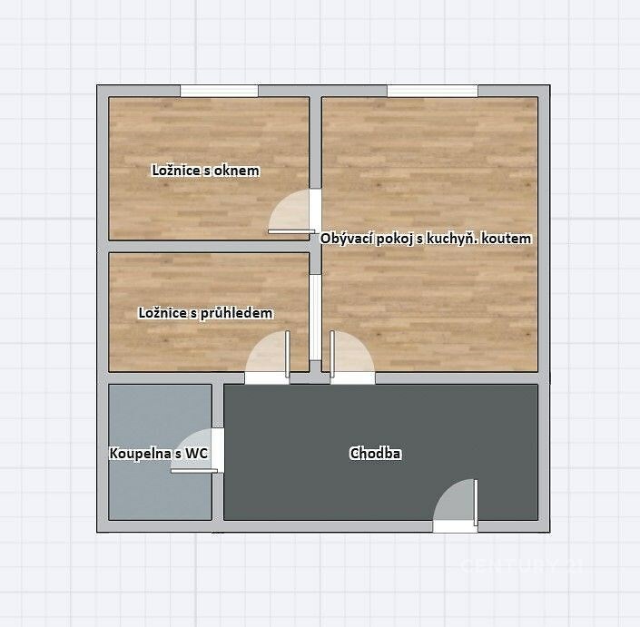 Byt se skládá ze dvou ložnic, z nichž jedna je orientovaná na východ a má plnohodnotné okno. Druhá ložnice je menší a je propojená s obývacím pokojem průsvitem denního světla přes skleněné luxfery. Dominantou bytu je prostorný obývací pokoj s jídelním koutem a plně vybavenou kuchyňskou linkou. Součástí je také moderní koupelna se sprchovým koutem a toaletou, kde je připravené místo pro pračku. Na chodbě jsou vestavěné skříně s velkým úložným prostorem. V celém bytě jsou nové vinylové podlahy a keramická dlažba.