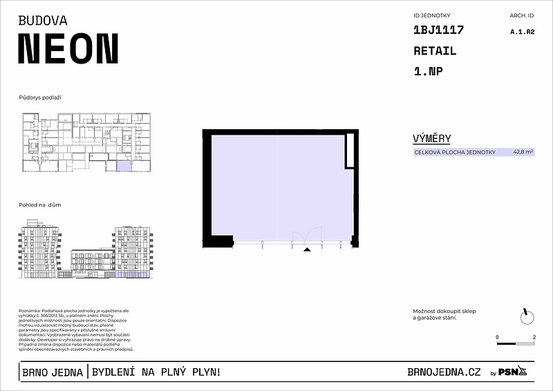 Obchodní prostor s přímým vstupem z ulice v přízemí nového rezidenčního projektu Neon&Xenon nabízí atraktivní zázemí pro podnikání v rychle se rozvíjející lokalitě s vysokým potenciálem. Retailová jednotka je součástí rozsáhlého areálu Brno Jedna, který poskytuje každodenní zázemí až pro 2 000 lidí. Retailová jednotka č. 1117 o celkové ploše 42.80 m² se nachází v přízemí budovy A. Prosvětlený prostor s výlohami orientovanými do veřejného prostoru je ideální pro provoz obchodu, služeb nebo gastro provozovny. Jednotka bude předána ve stavu shell & core, s přípravou na veškeré technické napojení. *Uvedená cena je vč. DPH