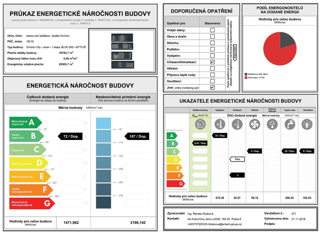 Praha 5 - Smíchov, ul. Albrightové – nachází se v unikátním nízkoenergetickém bytovém komplexu Smíchov City s vlastní uzavřenou zahradou, recepcí, několika restauracemi, kavárnami a obchody; oblíbená lokalita v těsném sousedství stanice metra Anděl a obchodního komplexu Nový Smíchov, s perfektním spojením do centra města a do tunelového systému. Nabízíme k pronájmu luxusní nezařízený byt 2 + kuchyňský kout (44,2 m2) + lodžie 3,4 m2 orientovaný na západní stranu, nachází se v 5. podlaží nového rezidenčního domu s výtahem. Byt tvoří prostorný obývací pokoj o velikosti 22 m2 s plně vybaveným kuchyňským koutem a se vstupem na lodžii, ložnice (12,1 m2) rovněž se vstupem na lodžii, koupelna se sprchovým koutem + WC a předsíň. Další vybavení bytu: plně vybavená kuchyňská linka včetně vestavěných spotřebičů (el. varná deska, el. trouba, mikrovlnka, myčka a lednice s mrazákem), dále jsou v bytě vestavěné skříně v předsíni a v ložnici, osvětlení, příprava pro vysokorychlostní internet (až 2 Gb/s), dřevěné podlahy, centrální vytápění a rekuperace. V ceně nájmu je zahrnut 1 sklep (4,2 m2). Byt je vhodný pro 1 – 2 osoby bez domácích zvířat. Cena 25.000 Kč/měsíc + služby (záloha 3.000 Kč/měsíc + spotřeba elektřiny v bytě) + internet + provize RK 1 měsíční nájem. Požadovaná jistota (kauce) činí 2 měsíční nájmy. Třída energetické náročnosti budovy je dle vyhlášky 78/2013 Sb. klasifikována jako B.