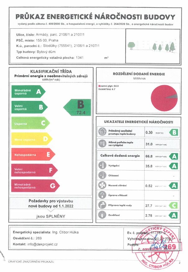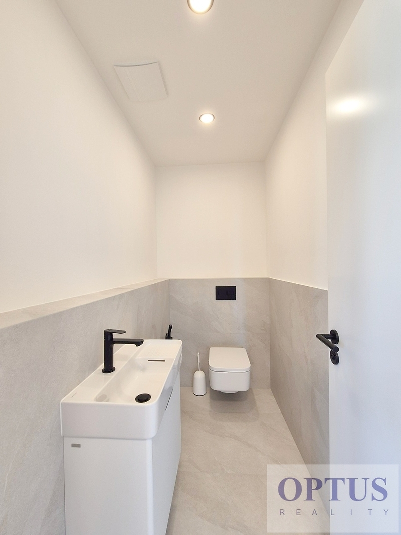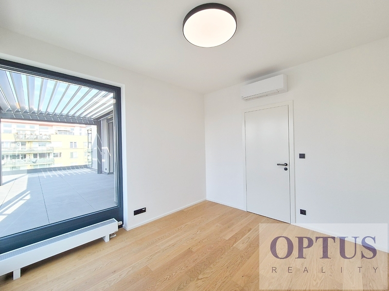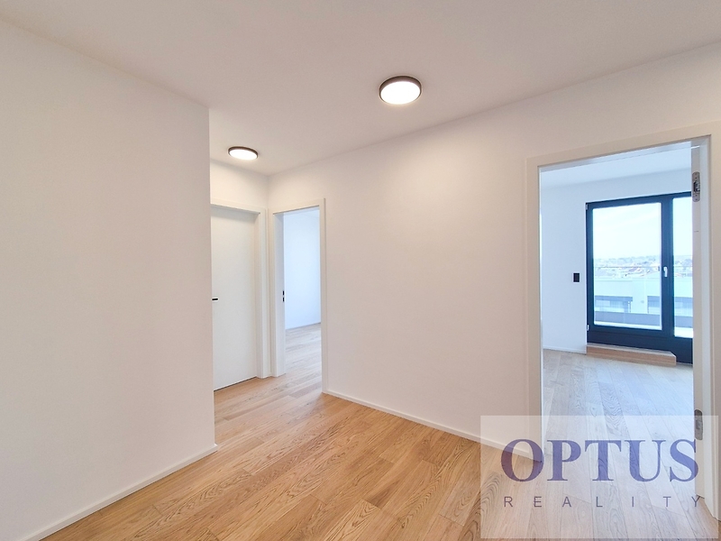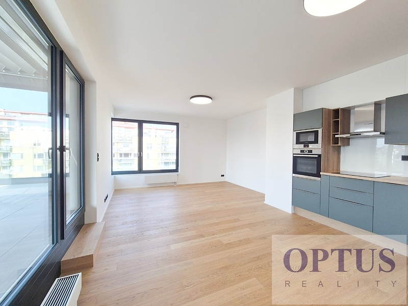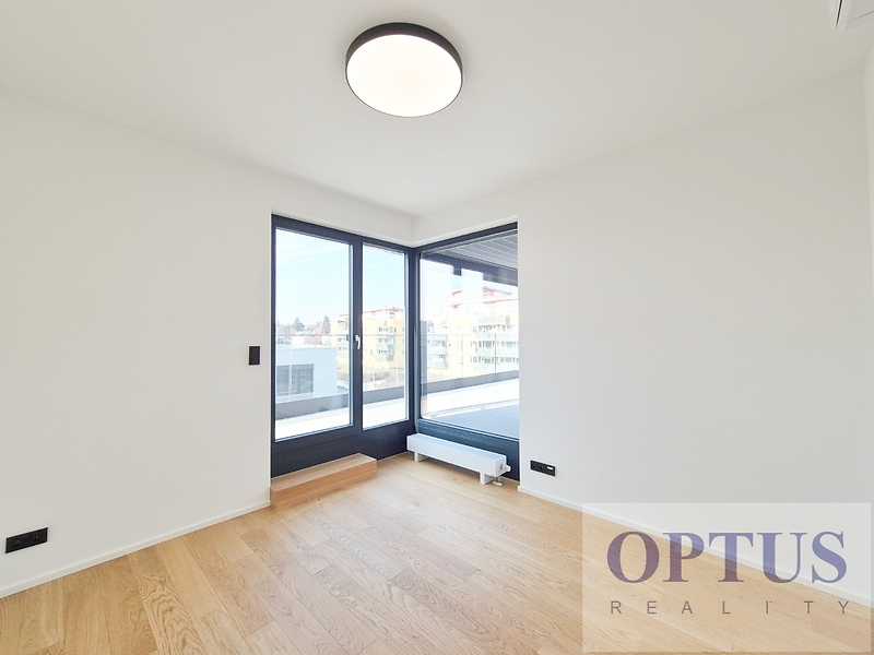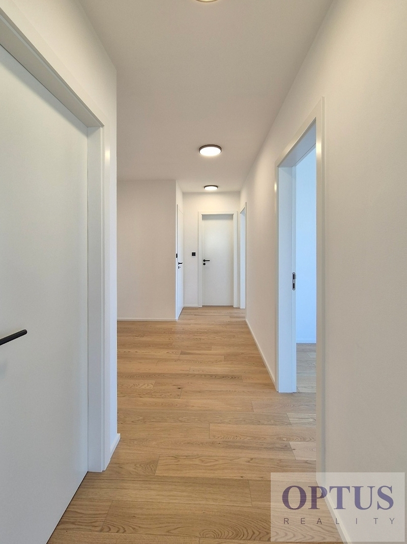 Praha 5 - Stodůlky, ul. Armády – oblíbená lokalita v docházkové vzdálenosti ke stanici metra Hůrka, přímo u Centrálního parku a v blízkosti nákupního centra Galerie Nové Butovice, s výborným dopravním spojením do centra a s výbornou dostupností D1, D5 a letiště. Nabízíme k pronájmu luxusní nový byt 3 + kuchyňský kout (podlahová plocha 84,9 m2) + terasa o velikosti 39,7 m2 orientovaná na severozápad, situovaný ve 4. nadzemním podlaží novostavby rezidenčního domu s výtahem. Byt byl dokončený byl v r. 2024 v rámci prémiového developerského projektu Rezidence Prokopský potok, je nezařízený a dosud nebyl obývaný. Byt zahrnuje prostorný obývací pokoj s kuchyňským koutem o výměře 31,3 m2 a se vstupem na terasu, dvě ložnice (14,3 m2 a 11,3 m2) rovněž se vstupem na terasu, koupelna se sprchovým koutem a WC, samostatné WC s bidetovou sprškou, komora a vstupní hala. Další vybavení bytu: kuchyňská linka včetně vestavěných spotřebičů (varné desky, el. trouby, mikrovlnné trouby, myčky, odsavače par a lednice s mrazákem), dále jsou v bytě předokenní elektricky ovládané žaluzie, elektricky ovládaná bio klimatická pergola, klimatizace, dřevěné podlahy, příprava pro vysokorychlostní internet (až 2 Gb/s), centrální plynové vytápění a podlahové vytápění v koupelně. Součástí pronájmu je i 1 sklep a 1 garážové stání v pozemních garážích domu. Cena 39.000 Kč/měsíc + služby (záloha 5.500 Kč/měsíc + spotřeba elektřiny v bytě) + internet + provize RK 1 měsíční nájem. Peněžní jistota (kauce) činí 2 měsíční nájmy. Třída energetické náročnosti budovy je dle vyhlášky vyhl. č. 264/2020 Sb. klasifikována jako B.