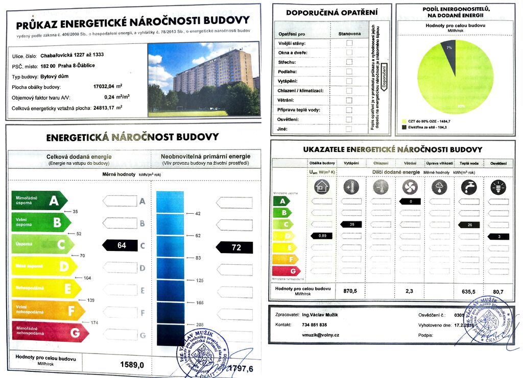 Praha 8 - Kobylisy, Chabařovická ul. – oblíbená lokalita v blízkosti stanice metra Ládví a Ďáblického háje, s kompletní občanskou vybaveností; autobusové a tramvajové zastávky se nachází do 4 minut chůze. V těsné blízkosti je supermarket Kaufland, mateřská školka, základní škola, několik veřejných sportovišť, poliklinika a další služby; během několika minut autem je dostupné nákupní centrum OC Letňany. Nabízíme částečně zařízený slunný byt 4 + kuchyně (96,57 m2) + lodžie 6,6 m2, situovaný ve 13. patře panelového domu po revitalizaci. Byt je prošel postupně rekonstrukcí a nabízí nádherný výhled na celou čtvrť. Byt tvoří obývací pokoj (24,62 m2) propojený se samostatnou kuchyní s jídelním koutem (11,47 m2), 3 ložnice o výměře cca 16 m2 / 13 m2 / 10 m2 – největší ložnice má francouzské okno, dále koupelna se sprchovým koutem, samostatná toaleta, komora a předsíň s vestavěnou skříní. K bytu náleží lodžie přístupná ze společné chodby domu. Další vybavení bytu: nábytek a vybavení dle fotografií, plně vybavená kuchyňská linka včetně spotřebičů (plynový sporák s elektrickou trouba, myčka, lednice s mrazákem a digestoř), dále je v bytě pračka, šatní skříně, vnitřní horizontální žaluzie, příprava pro vysokorychlostní internet (až 1 Gb/s), vinylové / laminátové podlahy / koberce, centrální vytápění. Cena 29.500 Kč/měsíc + poplatky (služby 6.200 Kč/měsíc + elektřina a plyn v bytě) + internet + provize RK 1 měsíční nájem. Peněžní jistota (kauce) činí 2 měsíční nájmy včetně služeb. Třída energetické náročnosti budovy je dle vyhlášky 78/2013 Sb. klasifikována jako C.