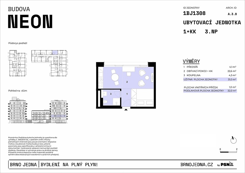 Praktický byt o dispozici 1+kk je součástí nového městského projektu Brno Jedna, který nabízí moderní bydlení s kompletním zázemím a výbornou dostupností do centra města. Jednotka č. 1308 o dispozici 1+kk a celkové ploše 32 m² vám nabídne harmonický prostor pro život, ať už hledáte vlastní zázemí, nebo investiční příležitost. Jednotka v 3. podlaží zahrnuje obytný prostor s přípravou na kuchyňský kout, elegantní koupelnu se sprchovým koutem a toaletou a vstupní část s místem pro úložné řešení. K jednotce je třeba zakoupit sklepní kóji a parkovací stání. Byt bude připraven k okamžitému nastěhování s dokončenými podlahami, vybavenou koupelnou a připraveným prostorem pro kuchyňskou linku. Vyšší standard zahrnuje kvalitní materiály, trojskla a u vybraných jednotek i přípravu na venkovní stínění. Brno Jedna je více než jen dům, je to místo, kde se dobře žije. Střešní terasa s grilem, workout zóna, kolárna, prádelna i kočárkárna, to vše vám nabídne pohodlí městského života. V okolí roste nová čtvrť s parkem, cyklostezkami i službami. Centrum města pak máte na dosah za pouhých 5 minut MHD či autem.