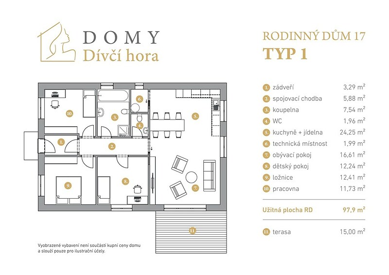 ►Právě zkolaudovaná novostavba RD č.17 o dispozici 4+kk o zastavěné ploše 122 m² s pozemkem 805 m² je připravena k předání. Vám už bude zbývat si jen dům vybavit kuchyní a nábytkem. Bungalov o dispozici 4+kk, ►zádveří 3,29 m² ►spojovací chodba 5,88 m² ►koupelna 7,54 m² ►WC 1,96 m² ►kuchyně + jídelna 24,25 m² ►technická místnost 1,99 m² ►obývací pokoj 16,61 m² ►pokoj 12,24 m² ►ložnice 12,41 m² ►pokoj 11,73 m² Z obývacího pokoje vstupujeme na terasu 15 m². ►K domu náleží 2 parkovací stání. V rámci technického vybavení můžete počítat s tepelným čerpadlem pro teplovodní podlahové topení i ohřev užitkové vody (s možností chlazení podlah v letních měsících) či s plastovými okny s trojskly. Laminátové plovoucí podlahy jsou v obytných místnostech, dlažba pak v chodbě, technické místnosti, koupelně a WC, zde dále obklady a sanita (vana nebo sprchový kout, WC, umyvadlo, baterie). Lokalita Dívčí hora, kde se rodinný dům nachází, leží na okraji obce Práče v bezprostředním sousedství Lechovic. Díky blízkosti hlavního tahu Brno – Znojmo Vám tak cesta autem do Znojma zabere pouhých 10 minut, do jihomoravské metropole bude trvat jen něco málo přes 30 min. V obci se nachází bohatá občanská vybavenost mateřská škola, 1. stupeň základní školy, obchody s potravinami, gastronomické zařízení, konají se zde pravidelné kulturní akce. Nalezneme zde i výborné podmínky pro sportovní aktivity fotbalové hřiště, sportovní halu nebo obcí vedoucí cyklostezku. V sousedních Lechovicích se nachází Zámek Lechovice s udržovaným parkem, v nedalekých Banticích je pak dostupné přírodní koupaliště a sportovní hřiště. A dále v Těšeticích je také golfové hřiště. Pro více informací a případnou prohlídku mě již nyní neváhejte kontaktovat. S financováním Vám rádi pomůžeme.