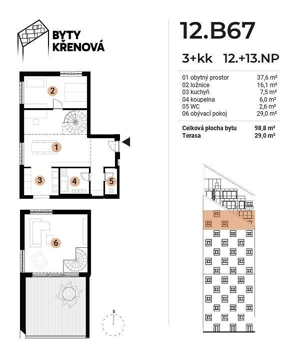 Přestavujeme Vám pokračování úspěšného projektu LOFT BLOK Křenová. Ikonická stavba, která přináší do centra města moderní design a výhledy, které vás nepřestanou bavit – Petrov, Špilberk i celé panorama Brna máte doslova na dosah. Tento projekt spojuje špičkovou architekturu, promyšlené dispozice a nadstandardní technické řešení. Ať už hledáte nový domov, nebo investici, která si drží hodnotu, tady najdete obojí – v té nejlepší brněnské lokalitě ve středu města. Bytová jednotka, která je řešená jako mezonet, o dispozici 3+kk a velikosti 98,80 m2 se nachází ve 12.NP a 13.NP z celkových 16.NP. K bytu náleží prostorná terasa (29 m2). Díky umístění ve vyšším podlaží se můžete těšit na krásný výhled směrem na město a dostatek denního světla. Standard bytu Světlé prostory, kvalitní vinylové podlahy a keramická dlažba Interiérové dřevěné dveře s obložkovými zárubněmi Bezbariérový přístup se dvěma výtahy Kompletní příprava na kuchyň a digestoř Klimatizace Centrální vytápění napojené na městskou teplárnu Optický internet, TV a audiotelefon u vstupu Možnost dokoupení garážového parkovacího stání a sklepní jednotky Jen pár kroků od Vašeho prahu naleznete kavárny, restaurace, obchody, dětská hřiště i zelené plochy pro relaxaci. Stačí nasednout na kolo a po přilehlé cyklostezce vyrazíte k brněnské přehradě či do klidných lesů Hádů. Moderní bydlení v centru Brna tak spojuje to nejlepší z nejlepší z — dynamiku velkoměsta a klid domova, který se Vám nikdy neomrzí. Do úplného centra Brna se dostanete za pár minut pěšky nebo tramvají, přičemž zastávky MHD se nacházejí v těsné blízkosti projektu. Hlavní vlakové a autobusové nádraží jsou vzdáleny jen pár minut chůze, což zajišťuje vynikající napojení nejen v rámci města, ale i na dálkové spoje. Autem jste na dosah městskému okruhu i nájezdům na dálnice D1 a D2. Ať už míříte do Prahy, Vídně nebo Bratislavy, hladké napojení Vám každý den ušetří cenný čas. Lokalita s vysokým potenciálem rozvoje – v blízkosti se plánují nové služby a vznikají další příležitosti, které zvýší komfort bydlení v docházkové vzdálenosti. Podívejte se na kompletní nabídku dalších jednotek na webu projektu BYTYKRENOVA.CZ – naleznete tam různé dispozice i velikosti, ze kterých si určitě vyberete. Předpokládaný termín dokončení je začátek roku 2027. Neváhejte nás kontaktovat – poradíme Vám s výběrem Vašeho vysněného bydlení či investice.