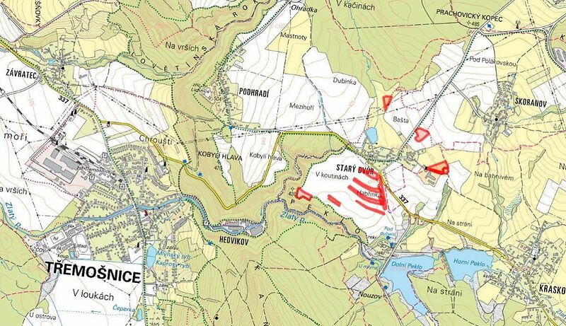 Prodáváme zemědělskou půdu v katastrálních území Podhradí v Železných horách a Starý Dvůr v okrese Chrudim. Katastrální území jsou součástí obce Třemošnice. Předmětem prodeje v KÚ Starý Dvůr je vlastnictví půdy na parcelách č. 252, 258, 259, 263, 271 a 279 zapsaných na listu vlastnictví 455. Dále na parcelách č. 49/16, 49/26, 49/28, 57/3, 146, 157 a 338 zapsaných na listu vlastnictví 527. V KÚ Podhradí v Železných horách je k prodeji parcela č. 373 zapsaná na LV 40. Pozemky leží v rovině v okolí obce Starý Dvůr. V katastrálních územích zatím neproběhly komplexní pozemkové úpravy. Celková výměra pozemků je 56 007 m2 a k prodeji je na nich 41 424 m2 ve skladbě: ostatní plocha 746 m2, trvale travní porost 12 008 m2 a orná půda 28 670 m2. Pro více informací kontaktujte našeho zástupce. Součástí ceny je již provize. Pro naše klienty zajišťujeme také související právní a administrativní služby. Majitel si vyhrazuje právo vybrat kupujícího na základě nabídky.