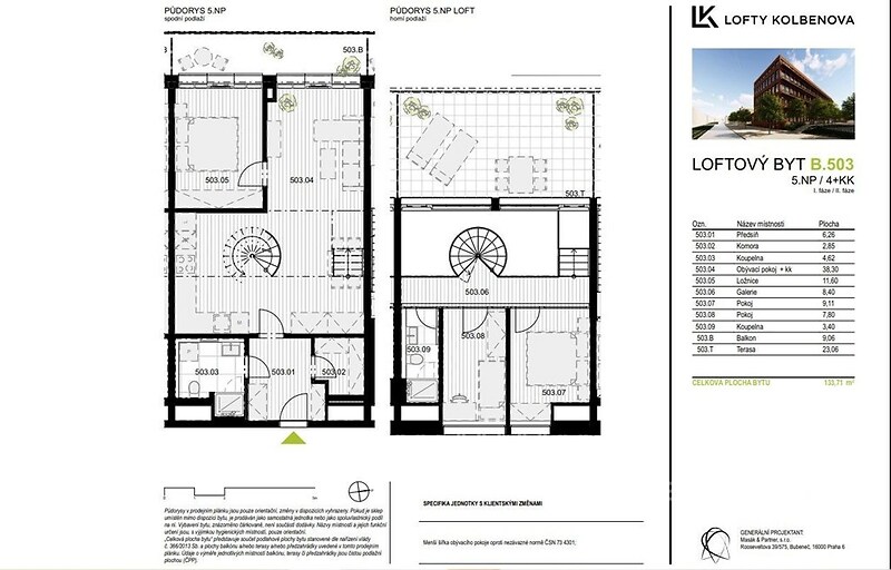 Prodej byt 4+kk, Praha 9 – Vysočany | designové bydlení v projektu Lofty Kolbenova Nabízíme k prodeji výjimečný loftový byt o dispozici 4+kk v projektu Lofty Kolbenova, Praha 9 – Vysočany. Byt se nachází v 5. nadzemním podlaží a disponuje podlahovou plochou 133,71 m². Základní parametry ✓ dispozice: 4+kk ✓ podlahová plocha: 133,71 m² ✓ podlaží: 5. NP ✓ balkon: 9,06 m² ✓ terasa: 23,06 m² ✓ parkování: možnost dokoupení ✓ sklep: možnost dokoupení ✓ energetická náročnost: B – velmi úsporná Stav nemovitosti Jedná se o byt v kompletně zrekonstruovaném industriálním objektu, který byl citlivě přeměněn na moderní rezidenční projekt Lofty Kolbenova. Byly zde zachovány typické prvky jako vysoké stropy, betonové konstrukce a velkoformátová tovární okna. Tento developerský projekt získal ocenění jako uznání za nejlepší stavbu využívající stávající objekt v bývalé průmyslové lokalitě. Dispozice V prvním podlaží se nachází šatna, koupelna se sprchovým koutem a toaletou, dále otevřený prostor připravený pro kuchyňskou linku s jídelní a obývací částí, samostatná ložnice a balkon. Ve druhém podlaží je k dispozici další koupelna se sprchovým koutem a toaletou, dva samostatné pokoje a velkorysá střešní terasa. Příslušenství Standard zahrnuje moderní technologie, jako je klimatizace, podlahové vytápění a rekuperací, která zajišťuje stabilní a zdravé vnitřní klima. Samozřejmostí jsou také předokenní žaluzie pro regulaci světla a teploty. Interiér kombinuje industriální prvky s kvalitními materiály – dřevěné podlahy v dekoru dubu, designové točité schodiště, osvětlení v industriálním stylu, stěna z pohledového betonu, ocelové detaily a přiznané betonové konstrukce. Pokoje v druhém podlaží jsou oddělené designovými skleněnými příčkami. K bytu je možné dokoupit parkovací stání a sklep. Byt je vhodný jak pro rodinné bydlení, tak i pro klienty hledající prostor s charakterem a originalitou. Lokalita Projekt Lofty Kolbenova se nachází v rychle se rozvíjející části Prahy 9 – Vysočany, která postupně mění svůj původní industriální charakter na moderní městskou čtvrť. Lokalita nabízí kombinaci nové rezidenční výstavby, služeb a autentické atmosféry bývalých průmyslových areálů. Skvělou dopravní dostupnost zajišťuje metro B Kolbenova (cca 4 minuty chůze) a tramvajová zastávka vzdálená jen 2 minuty. Do centra města se dostanete přibližně za 15 minut. V okolí najdete kompletní občanskou vybavenost – obchody, restaurace, kavárny i sportovní zařízení. V blízkosti se nachází také oblíbená lokalita Pragovka s kulturním a komunitním přesahem. Pro volný čas lze využít parky Podviní a Zahrádky nebo cyklostezku podél Rokytky. Lokalita tak nabízí vyvážené spojení městského života a zeleně.