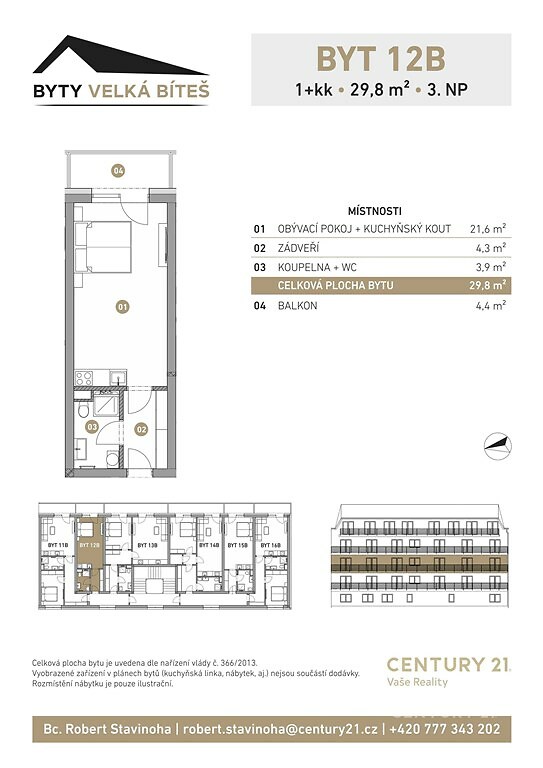 Projekt Byty Velká Bíteš pokračuje další etapou výstavby bytového domu s označením BD04 a nabídne celkem 28 bytových jednotek o dispozicích 1kk a 2kk. Je zde kladen důraz na komfortní bydlení s nízkými provozními náklady, kvalitními materiály a nadčasovým designem. Většina bytů bude disponovat balkónem s pěkným výhledem na přilehlou zeleň a centrum města. Ke každému bytu lze přikoupit sklepní kóje. Pro ty, kteří by chtěli kryté parkovací stání, budeme mít připraveno 7 garážových parkovacích stání v 1. podzemním podlaží. Samozřejmostí je dostatek parkovacích míst v okolí bytového domu. Součástí domu bude moderní výtah pro zajištění komfortní přepravy ať už z přízemí či garážových prostor přímo na patro k jednotlivým bytům, čímž je zajištěn bezbariérový přistup. Předpokládaný termín dokončení je podzim 2027. Uvedený byt: 12B, 3. NP, s podlahovou plochou vč. balkonu 34,2 m2, užitná plocha bytu 29,1 m2 + 4,4 m2 balkón. K bytu je možnost dokoupit: garážové parkovací stání podzemní = 425 600 Kč vč. DPH sklepní kóje = 56 000 Kč vč. DPH Ve standardním provedení každého bytu jsou laminátové podlahy EGGER, obklady a dlažby ABITARE ICON v koupelně a na toaletě vč. sanity (sprchový kout s odtokovým žlábkem, WC, umyvadlo, baterie, zrcadlo s LED podsvícením), interiérové dveře, bezpečnostní vstupní dveře a okna s trojskly. Vytápění zajištěno pomocí elektrického podlahového topení, dále příprava na klimatizaci na JV straně, zvýhodněné nabídky dodání a montáže kuchyňské linky přímo od investora. Bytový dům bude plnit PENB–B. Velká Bíteš je město s rodinnou atmosférou, výbornou polohou a širokými možnostmi pro život i práci. Díky strategické dostupnosti u dálnice D1 se do Brna i Jihlavy dostanete během pouhých 30 minut, což z města činí ideální místo pro všechny, kdo hledají klidné bydlení blízko větších center. Město je zároveň významným průmyslovým centrem. Sídlí zde například společnost PBS, výrobce leteckých motorů, a lokalita bude v budoucnu profitovat i díky plánované výstavbě nových jaderných bloků v Dukovanech. To zvyšuje nejen poptávku po kvalitním bydlení, ale také investiční potenciál nemovitostí. Vznikající bytové jednotky, které jsou ideální pro vlastní bydlení i jako výhodná investice, jsou navrženy s důrazem na nízké provozní náklady, kvalitní materiály a nadčasový design, aby zajišťovaly komfortní a dlouhodobě hodnotné bydlení. Občanská vybavenost je v místě kompletní – školy, školky, obchody, zdravotní péče a další služby jsou snadno dostupné. V bezprostřední blízkosti se navíc připravuje nový městský park, který doplní okolní přírodu a nabídne prostor pro sport, relaxaci a volnočasové aktivity. Sportovní vyžití nabízí hokejový stadión HC Spartak Velká Bíteš a fotbalový klub FC PBS Velká Bíteš. Projekt Byty Velká Bíteš je kombinací komfortu, moderní architektury a strategické polohy. Ať už hledáte vlastní domov, nebo investici s perspektivou růstu hodnoty, tyto byty představují ideální volbu pro současné i budoucí generace.