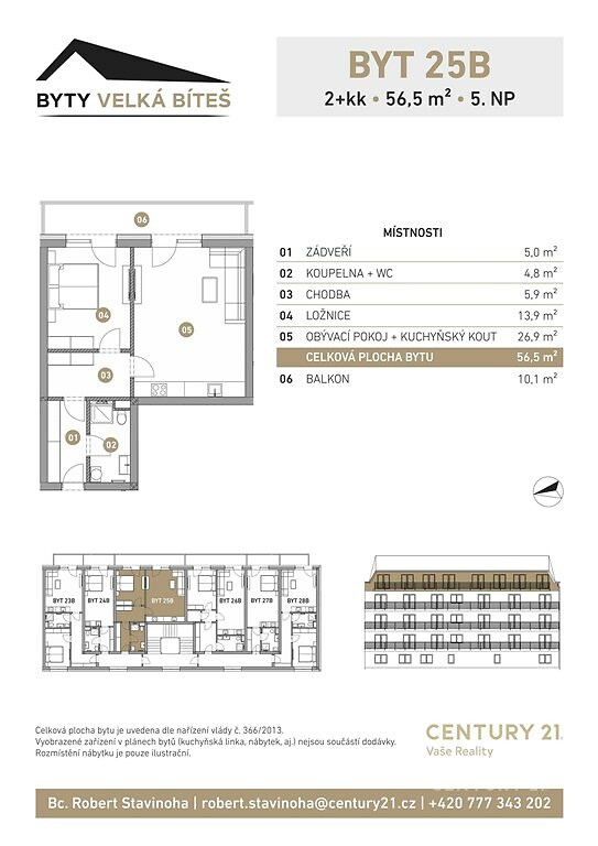 Projekt Byty Velká Bíteš pokračuje další etapou výstavby bytového domu s označením BD04 a nabídne celkem 28 bytových jednotek o dispozicích 1kk a 2kk. Je zde kladen důraz na komfortní bydlení s nízkými provozními náklady, kvalitními materiály a nadčasovým designem. Většina bytů bude disponovat balkónem s pěkným výhledem na přilehlou zeleň a centrum města. Ke každému bytu lze přikoupit sklepní kóje. Pro ty, kteří by chtěli kryté parkovací stání, budeme mít připraveno 7 garážových parkovacích stání v 1. podzemním podlaží. Samozřejmostí je dostatek parkovacích míst v okolí bytového domu. Součástí domu bude moderní výtah pro zajištění komfortní přepravy ať už z přízemí či garážových prostor přímo na patro k jednotlivým bytům, čímž je zajištěn bezbariérový přistup. Předpokládaný termín dokončení je podzim 2027. Uvedený byt: 25B, 5.NP, s podlahovou plochou vč. balkonu 66,6 m2, užitná plocha bytu 56,5 m2 + 10,1 m2 balkón. K bytu je možnost dokoupit: garážové parkovací stání podzemní = 425 600 Kč vč. DPH sklepní kóje = 56 000 Kč vč. DPH Ve standardním provedení každého bytu jsou laminátové podlahy EGGER, obklady a dlažby ABITARE ICON v koupelně a na toaletě vč. sanity (sprchový kout s odtokovým žlábkem, WC, umyvadlo, baterie, zrcadlo s LED podsvícením), interiérové dveře, bezpečnostní vstupní dveře a okna s trojskly. Vytápění zajištěno pomocí elektrického podlahového topení, dále příprava na klimatizaci na JV straně, zvýhodněné nabídky dodání a montáže kuchyňské linky přímo od investora. Bytový dům bude plnit PENB–B. Velká Bíteš je město s rodinnou atmosférou, výbornou polohou a širokými možnostmi pro život i práci. Díky strategické dostupnosti u dálnice D1 se do Brna i Jihlavy dostanete během pouhých 30 minut, což z města činí ideální místo pro všechny, kdo hledají klidné bydlení blízko větších center. Město je zároveň významným průmyslovým centrem. Sídlí zde například společnost PBS, výrobce leteckých motorů, a lokalita bude v budoucnu profitovat i díky plánované výstavbě nových jaderných bloků v Dukovanech. To zvyšuje nejen poptávku po kvalitním bydlení, ale také investiční potenciál nemovitostí. Vznikající bytové jednotky, které jsou ideální pro vlastní bydlení i jako výhodná investice, jsou navrženy s důrazem na nízké provozní náklady, kvalitní materiály a nadčasový design, aby zajišťovaly komfortní a dlouhodobě hodnotné bydlení. Občanská vybavenost je v místě kompletní – školy, školky, obchody, zdravotní péče a další služby jsou snadno dostupné. V bezprostřední blízkosti se navíc připravuje nový městský park, který doplní okolní přírodu a nabídne prostor pro sport, relaxaci a volnočasové aktivity. Sportovní vyžití nabízí hokejový stadión HC Spartak Velká Bíteš a fotbalový klub FC PBS Velká Bíteš. Projekt Byty Velká Bíteš je kombinací komfortu, moderní architektury a strategické polohy. Ať už hledáte vlastní domov, nebo investici s perspektivou růstu hodnoty, tyto byty představují ideální volbu pro současné i budoucí generace.