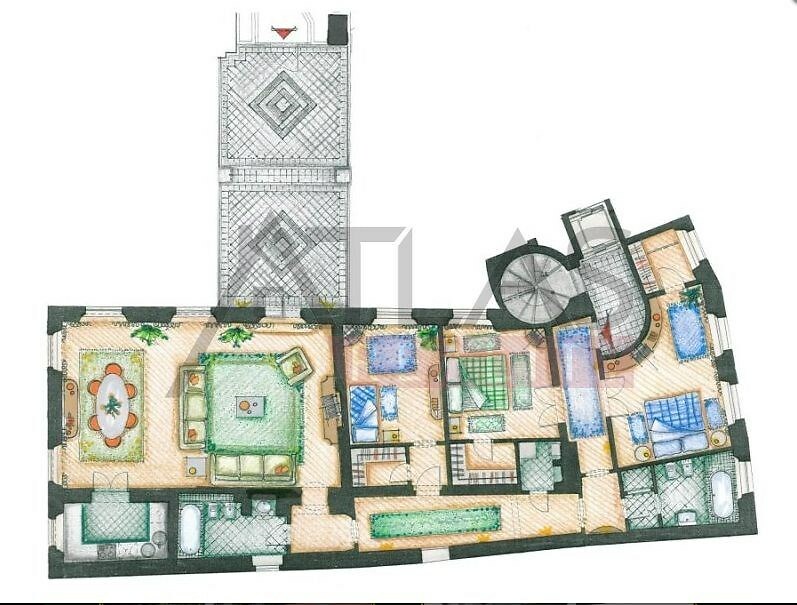 Pronájem bytu 4+1, 178 m2, ve 2. poschodí. Prestižní apartmá z doby baroka, prostorný obyvací pokoj s jídelnou, vnitřní design a dokončovací práce na velmi vysoké úrovni. Dva vchody, terasa 35 m² (obývací pokoj, jídelna, kuchyň, 3 ložnice, 2 koupelny, komora, 3šatny). Částečně zařízený, vhodný pro 6 osob. Dva vchody: pvní přímo z výtahu. Obytná část: obývací pokoj s jídelnou, plně vybavená kuchyň, komora. Spací část: propojená velkou vstupní halou, 3 ložnice se 3 šatnami, 2 koupelny s vanami, jedna s prostorným sprchovým boxem. Velká terasa na jižní straně.Do nájemného nejsou zahrnuty energie, služby ani poplatky za spolecné prostory. Domácí zvířata jsou povolena.