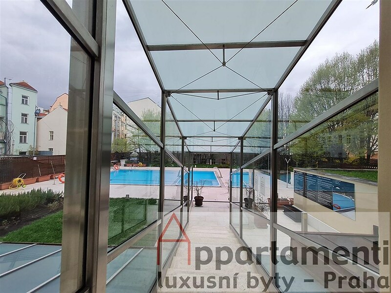 Pronájem luxusního residenčního bytu 3+Kk, 94m2 s balkónem ve 2.patře residenčního domu se zahradou a vyhřívaným bazénem v ceně nájmu a recepcí kousek od nám. Míru. Možnost pronájmu garážové stání za cenu od €200 plus DPH plus poplatky. Byt je dispozičně obývací pokoj s kuchyní, dvě ložnice, jedna se vstupem na balkón a 2x koupelna.