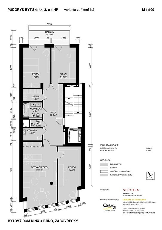 Prostor, světlo, komfort, krásný výhled z celého bytu, moderní architektura? Vše v jednom v Žabovřeskách. Jedinečná příležitost pronájmu bytu v Brně v Žabovřeskách o dispozici 4+KK a celkové ploše 129 m2. Prostorný, světlý byt o vnitřní podlahové ploše 120m2 s balkonem 9 m2 je orientován do klidného vnitrobloku do zahrad, nabízí uživatelům výhled na vzrostlé stromy. Parkování přímo v domě v zakladačích. Společným jmenovatelem celého bytového domu je mimořádné soukromí a velkorysý obytný prostor (na každém patře je pouze jeden byt), komfort (bezbariérový přístup výtahem až do bytu, parkování v domě) a světlo (dřevěná francouzská okna se skleněným zábradlím, speciální akustické ventilační mřížky do ulice). Špičkové standardy vybavení interiéru domu a bytu travertinový obklad vstupní haly, dřevěné dubové podlahy, dýhované dveře, s nerezovými klikami, koupelna s dvojumyvadlem a bidetem, podlahové topení s vlastním kotlem. Lokalita bytového domu je v oblíbené a vyhledávané čtvrti Brna „staré Žabovřesky“, nedaleko od centra města. V těsné blízkosti se nachází například Wilsonův les a sportovní areál Rosnička, ale také jedna z nejlepších základních škol města – ZŠ Sirotkova a elitní Gymnázium Matyáše Lercha. Autor projektu, prof. Ing. arch. Petr Pelčák, klade nebývalý důraz na kvalitní provedení a architekturu nejen domu jako celku, ale i řešením detailů interiérů. Cena podnájmu je 35.000, za byt, 2.000, za parkování. K ceně nájemného budou připočteny zálohy na služby ve výši 6.000, korun. Pro sjednání prohlídky Vašeho nového bydlení bez kompromisů kontaktujte makléřku. Volné ihned.